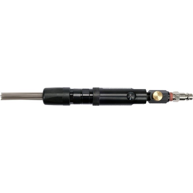 Mini-Nadelhammer zum Entfernen von Rost, Schweißnähten und für Blecharbeiten. Die kompakte Bauweise ermöglicht präzises Arbeiten in Ecken und Kanten. Über das Regelventil lässt sich die Schlagfrequenz einstellen. Die Möglichkeit, die Richtung des Luftstroms einzustellen, erhöht den Arbeitskomfort für den Anwender.