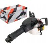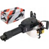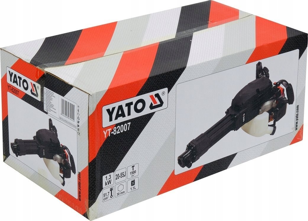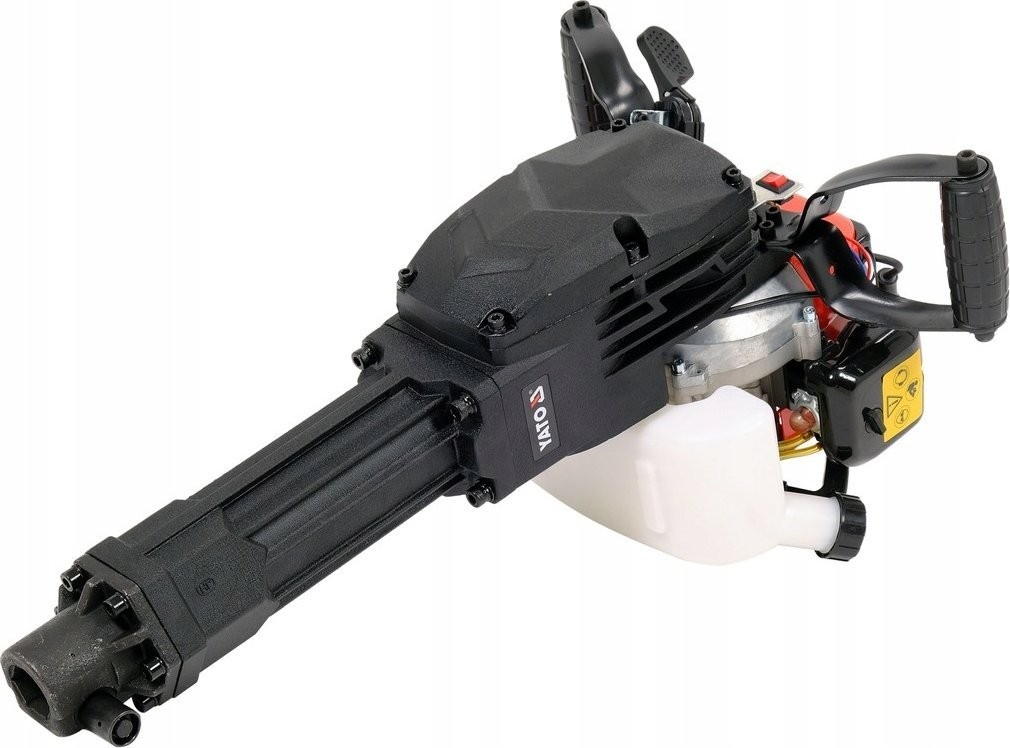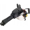 Abbruchhammer mit Zweitakt-Verbrennungsmotor. Das Gerät wiegt 11 kg und lässt sich daher bequem bedienen. Die Schlagkraft von 55 J zerkleinert effizient Stahlbeton, wie er in Fundamenten verwendet wird, sowie Naturstein. Der geringe Kraftstoffverbrauch (0,9 l/h) macht das Gerät sehr wirtschaftlich. Im Gegensatz zu Elektrohämmern sind keine schweren Stromaggregate erforderlich, die mindestens 40 kg wiegen und den Einsatz eines Zweierteams erfordern. Der Hammer YT-82007 kann von einer Person ohne großen Kraftaufwand bedient werden. Neben der Meißelfunktion kann dieser Hammer auch als Stampfer zur Bodenverdichtung eingesetzt werden (passend für 30-mm-Sechskantfuß YT-47385).