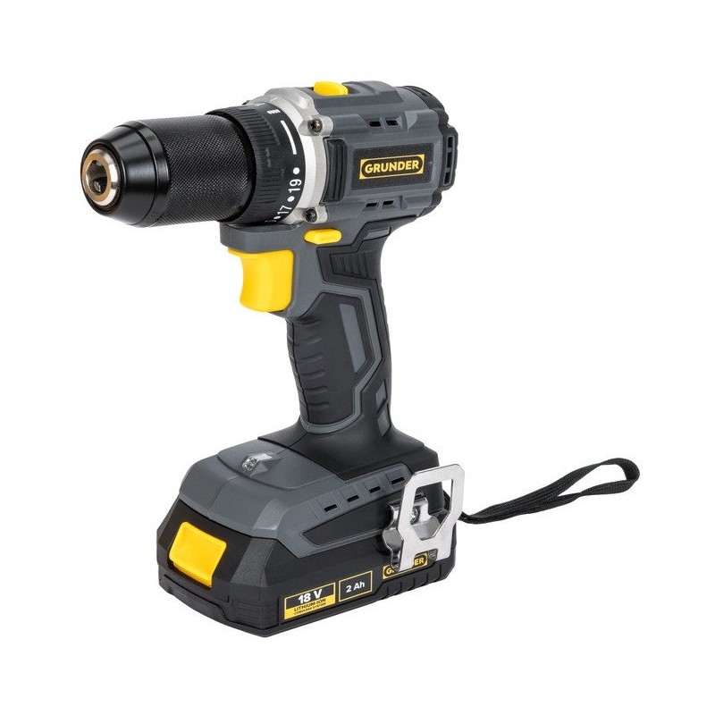 Die Grunder CD-B0A18 bietet zwei Drehzahlen, wodurch die Arbeit an verschiedene Materialien angepasst werden kann. Die integrierte LED-Beleuchtung erleichtert das Arbeiten an schlecht beleuchteten Stellen, und die Akkuladeanzeige informiert über den Ladezustand, was den Bedienkomfort erhöht.