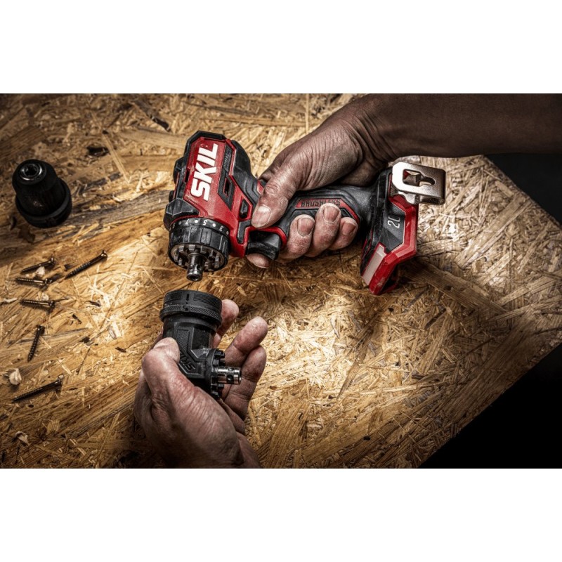 Der Bohr- und Schraubendreher Skil 3066CA bietet dank austauschbarer Aufsätze maximale Flexibilität. Im Lieferumfang enthalten sind ein 10-mm-Bohrfutter, ein Winkelaufsatz, ein Aufsatz für das Schrauben nahe am Rand sowie ein ¼"-Sechskantfutter für Schraubbits. So kann der Anwender das Werkzeug an verschiedene Aufgaben anpassen, sowohl in Holz als auch in Metall.