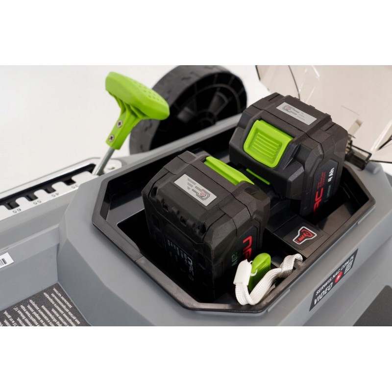 Der Rasenmäher ist mit zwei Akkus mit einer Kapazität von jeweils 4 Ah ausgestattet, was längere Mähvorgänge ohne häufiges Aufladen ermöglicht. Die Ladezeit der Akkus beträgt 60 bis 140 Minuten, sodass Sie schnell wieder an die Arbeit im Garten gehen können.