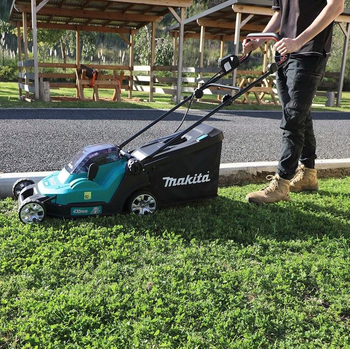 Mit einer Schnittbreite von 43 cm eignet sich der Makita DLM432CT2 perfekt für kleinere und mittelgroße Gärten und ermöglicht ein schnelles und präzises Mähen des Rasens.