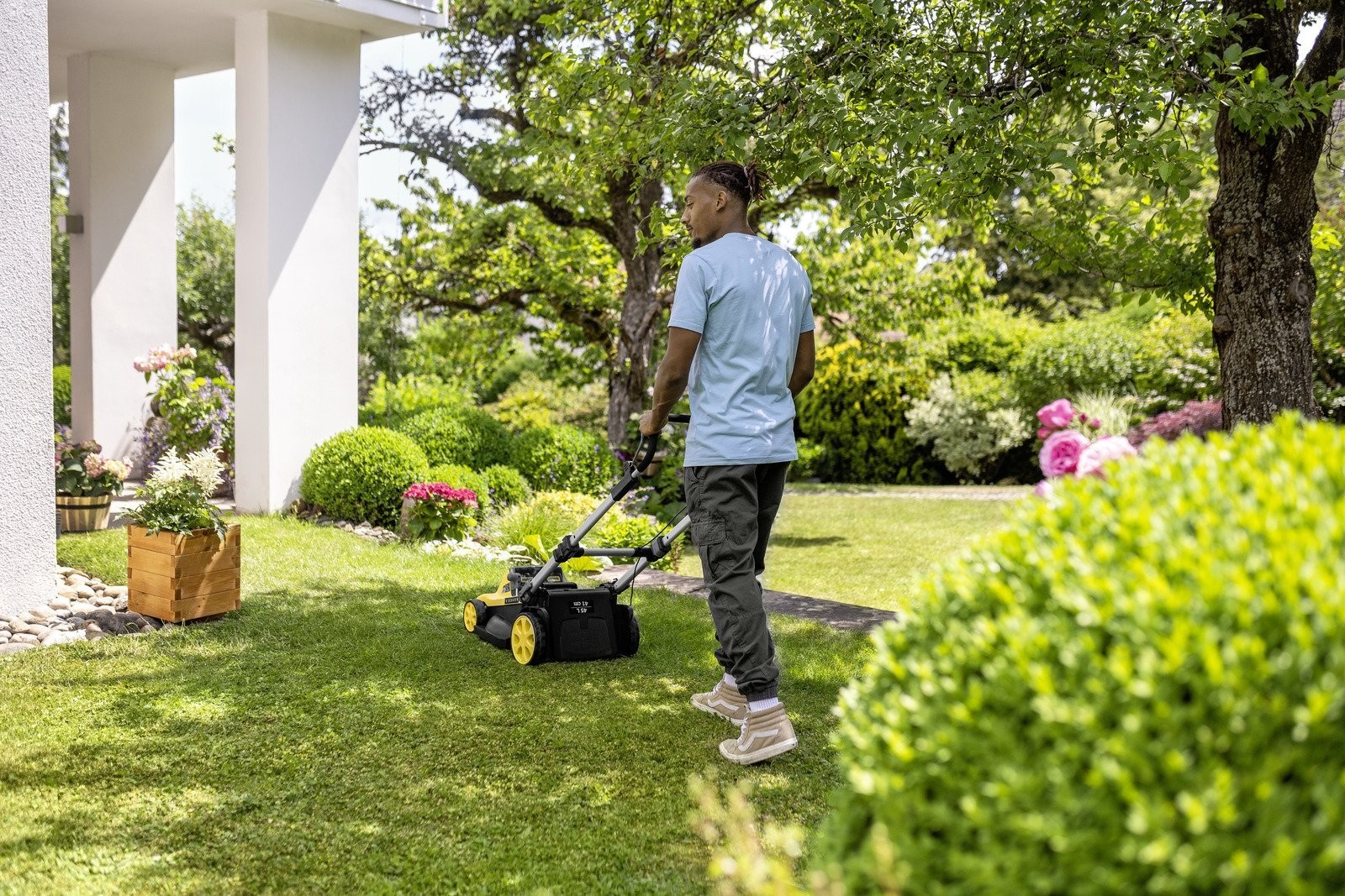 Der Rasenmäher ist mit einem 2-in-1-System ausgestattet, das sowohl das Sammeln des Grases in einem 45-Liter-Behälter als auch das Mulchen ermöglicht, wobei das gemähte Gras als natürlicher Dünger verteilt wird. Die sechsstufige Schnitthöhenverstellung (25–75 mm) ermöglicht die Anpassung des Geräts an individuelle Bedürfnisse. Dank der Kantenschneidefunktion schneidet der Rasenmäher das Gras auch an schwer zugänglichen Stellen präzise ab. Der Teleskopgriff und die klappbare Konstruktion erleichtern die Lagerung und den Transport.