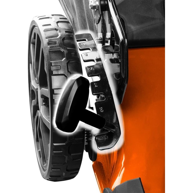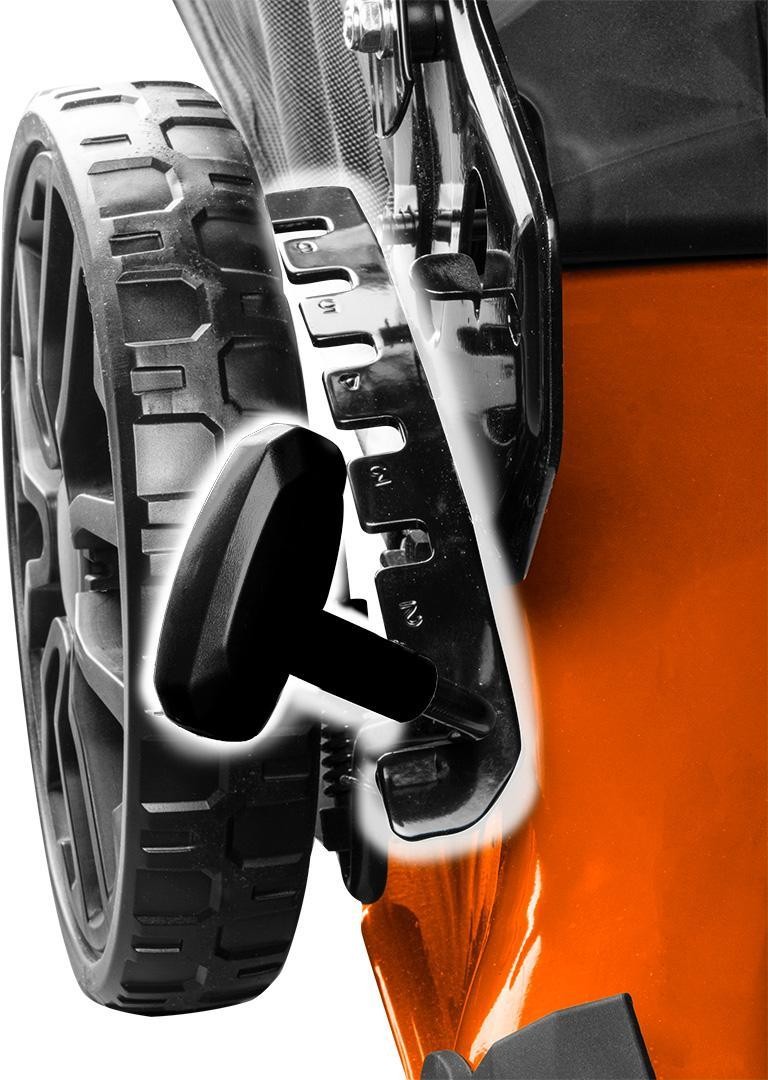 Der ergonomische Griff und die gut ausbalancierte Achse des Geräts ermöglichen eine leichte und geschickte Führung des Geräts. Rasenmähen war noch nie so einfach und angenehm!