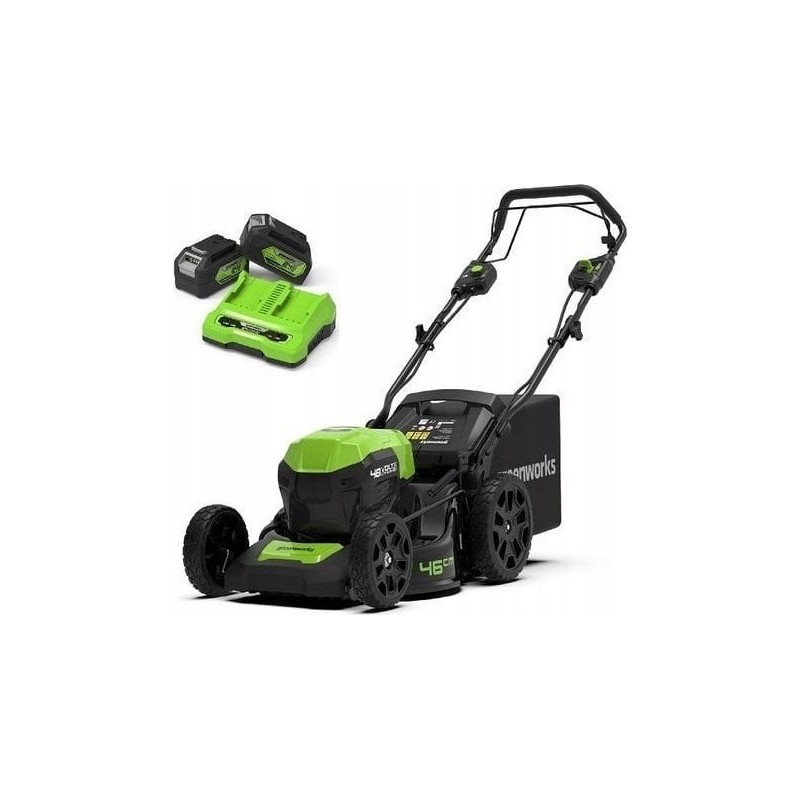 Greenworks 2x24-V-Akku-Rasenmäher mit 46-cm-Mähwerk G24X2LM46SPK4X – Set mit Dual-Ladegerät + 2 Akkus à 4 Ah