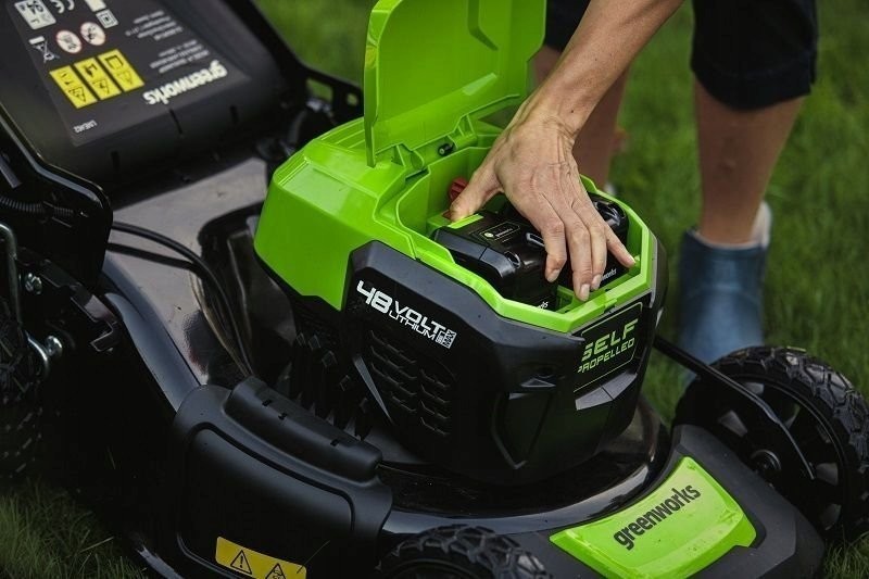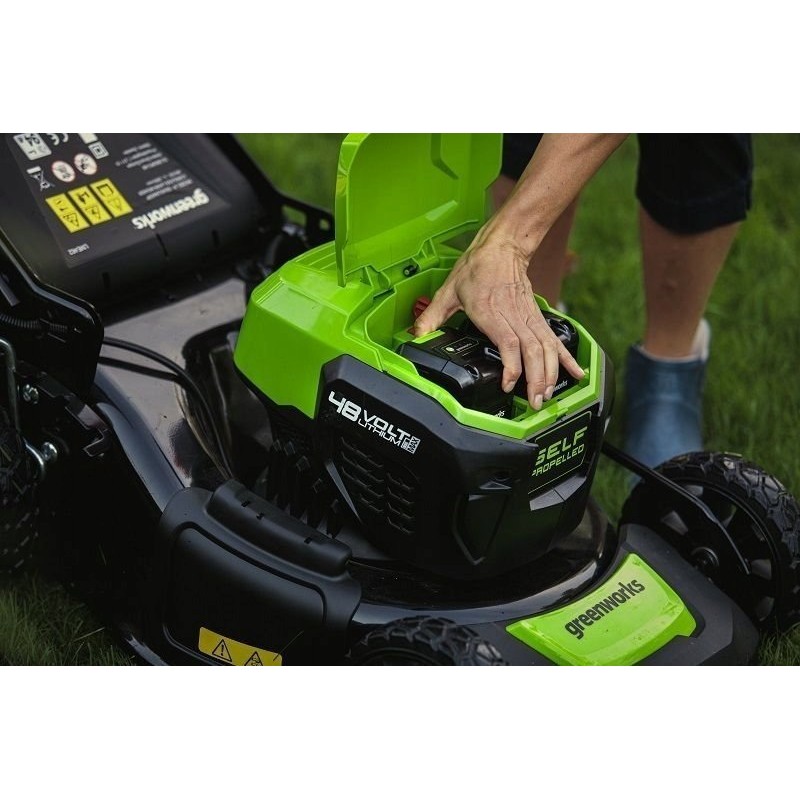 Dies ist der leistungsstärkste Rasenmäher aus der 48-V-Kollektion. Die sehr große Schnittbreite von bis zu 46 cm reicht dank der beiden Akku-Steckplätze aus, um eine Fläche von bis zu 750 m² mit einer einzigen Akkuladung zu mähen. Ein großer Vorteil ist der stufenlos regelbare Hinterradantrieb. Dies wird sicherlich jeder Nutzer zu schätzen wissen, der über ein Grundstück von mehr als 500 m² verfügt oder dessen Grundstück uneben ist oder Hanglagen aufweist.