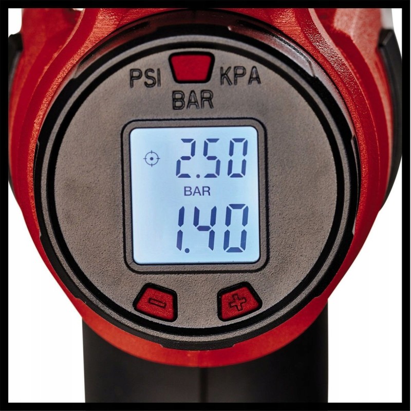 Das Gerät verfügt über ein spezielles digitales Display, auf dem der aktuelle Betriebsdruck sowie der voreingestellte Druck im Bereich von 0 bis 11 bar abgelesen werden können. Wahlmöglichkeit der Druckeinheit: bar, psi oder kPa.