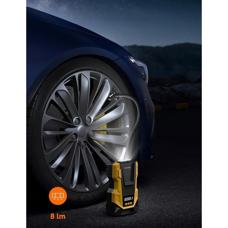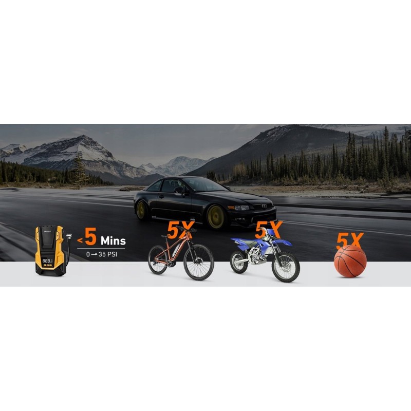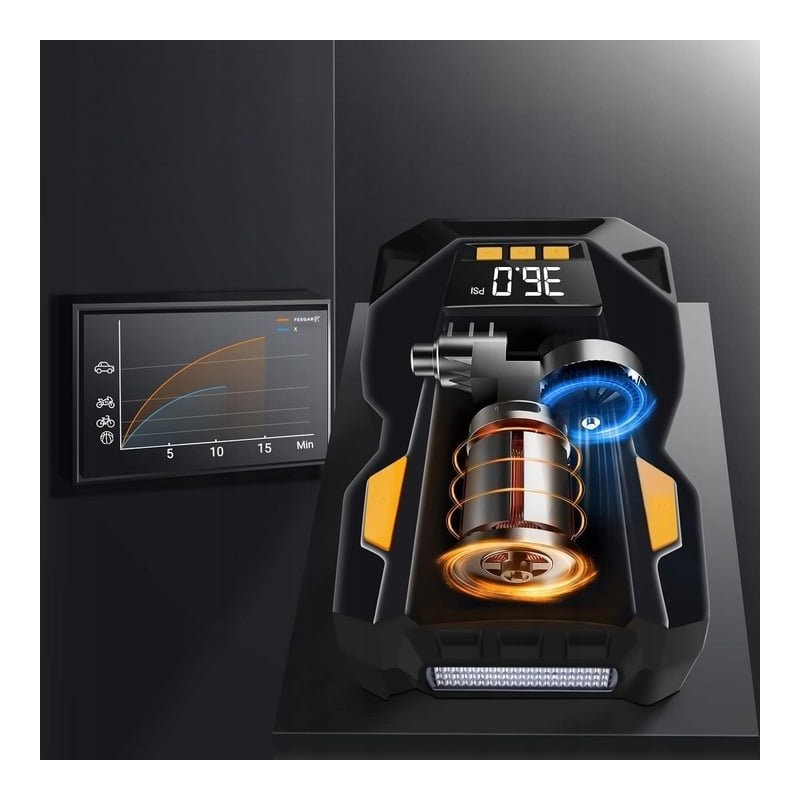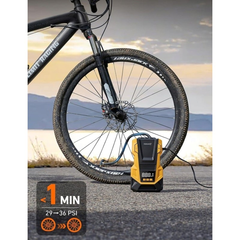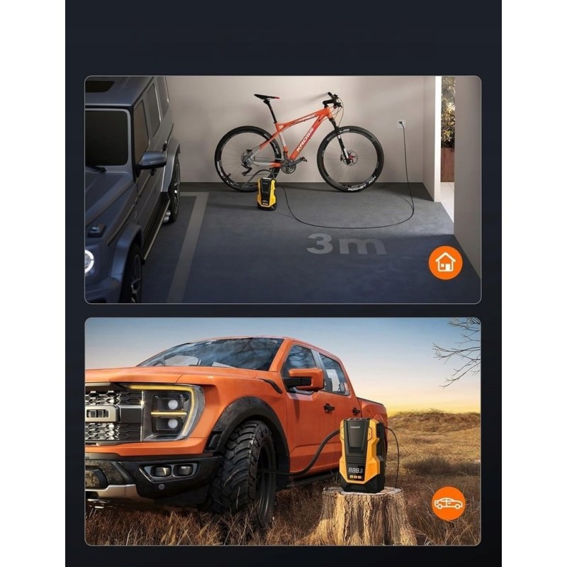 Die Pumpe kann Reifen schnell mit einem maximalen Druck von 150 PSI und einem Luftdurchsatz von 36 l/min aufpumpen. In nur 1 Minute kann die Pumpe einen Reifen von 25 auf 36 PSI aufpumpen und in 5 Minuten einen Autoreifen von 0 auf 36 PSI vollständig aufpumpen. Sie eignet sich ideal zum Aufpumpen von Autos, Motorrädern, Rollern, Fahrrädern, Bällen und anderen aufblasbaren Gegenständen.