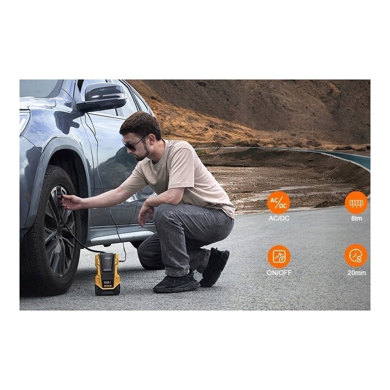 Die Luftpumpe verfügt über eine Doppelstromversorgung, die es ermöglicht, zwischen dem 230-V-Netzbetrieb und dem 12-V-Autostrombetrieb umzuschalten. Dank der AC/DC-Doppelstromversorgung unseres tragbaren Luftkompressors kann dieser sowohl über den Zigarettenanzünder im Auto als auch über eine Steckdose in der Garage mit Strom versorgt werden. So musst du dir unterwegs nie Sorgen machen, dass dir der Strom ausgeht.