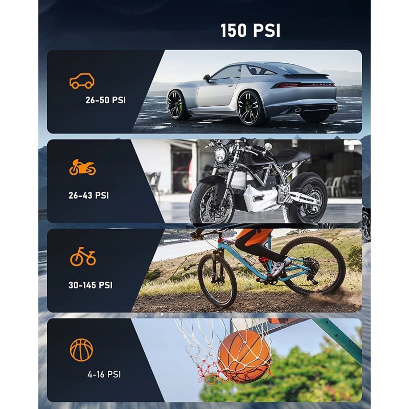 Die Pumpe kann Reifen schnell mit einem maximalen Druck von 150 PSI und einem Luftdurchsatz von 34 l/min aufpumpen. In nur 1 Minute kann die Pumpe einen Reifen von 25 auf 36 PSI aufpumpen und in 5 Minuten einen Autoreifen von 0 auf 36 PSI vollständig aufpumpen. Sie eignet sich ideal zum Aufpumpen von Autos, Motorrädern, Rollern, Fahrrädern, Bällen und anderen aufblasbaren Gegenständen.