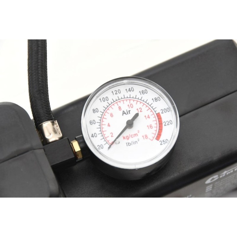 Hochleistungs-Luftkompressor mit 12-V-/230-V-Stromversorgung. Die Stromkabel und die Schläuche zum Aufpumpen sind ausreichend lang: 12 V – 260 cm / 230 V – 150 cm sowie ein Schlauch von 0,5 m. Der Kompressor ist mit einem integrierten Manometer ausgestattet, das den gemessenen Druck in verschiedenen Einheiten anzeigt.