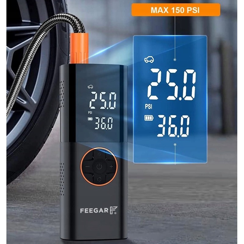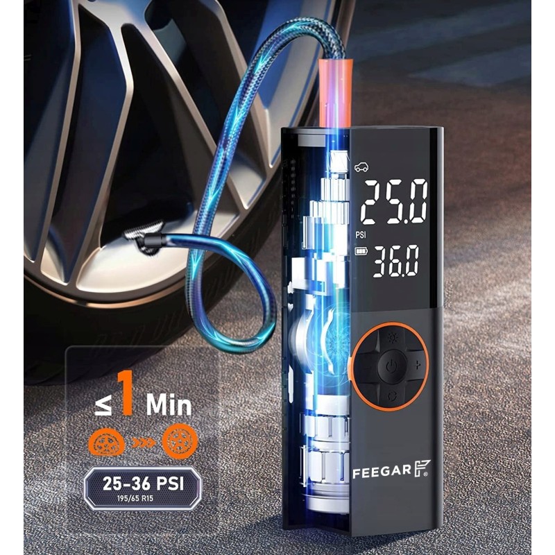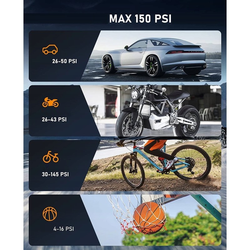 Die Pumpe kann Reifen schnell mit einem maximalen Druck von 150 PSI und einem Luftdurchsatz von 34 l/min aufpumpen. In nur 1 Minute kann die Pumpe einen Reifen von 25 auf 36 PSI aufpumpen und in 5 Minuten einen Autoreifen von 0 auf 36 PSI vollständig aufpumpen. Sie eignet sich ideal zum Aufpumpen von Autos, Motorrädern, Rollern, Fahrrädern, Bällen und anderen aufblasbaren Gegenständen.