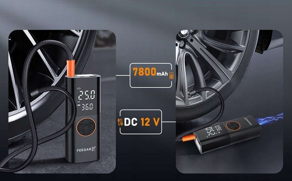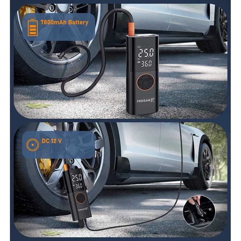 Die Luftpumpe verfügt über eine Dual-Stromversorgung, die es ermöglicht, zwischen dem kabellosen Modus und dem 12-V-Autoanschluss zu wechseln. Ausgestattet mit einem Lithium-Ionen-Akku mit einer hohen Kapazität von 7800 mAh kann sie bis zu 12 Autoreifen mit einer einzigen Ladung aufpumpen (abhängig von der Reifengröße). Für den Fall, dass der Akku leer ist, wird ein 12-V-Stromkabel mitgeliefert, mit dem die Pumpe über den Anschluss im Auto mit Strom versorgt werden kann. So musst du dir unterwegs nie Sorgen machen, dass dir der Strom ausgeht.