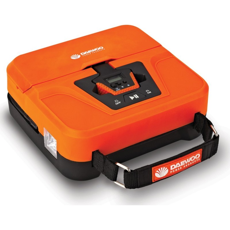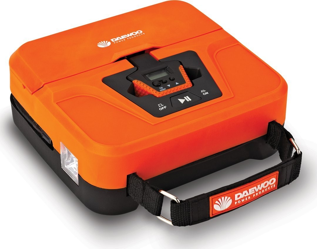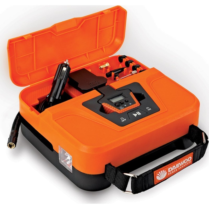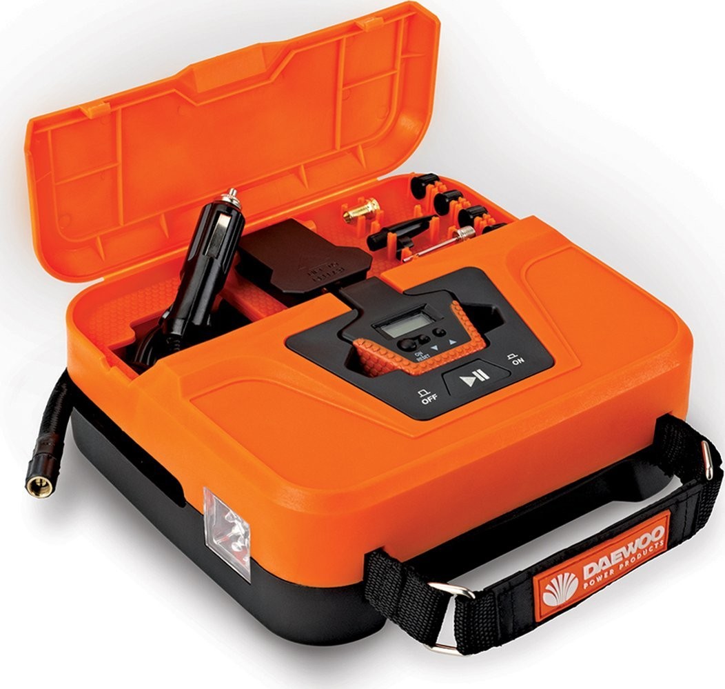 Daewoo DW 40L. Förderleistung: 25 l/min, Maximaler Druck: 7,5 bar. Produktfarbe: Schwarz, Orange, Geeignet für: Auto. Stromquelle: Zigarettenanzünder, Betriebsspannung: 12 V. Produktgewicht: 1,2 kg, Kabellänge: 3,5 m, Schlauchlänge: 0,45 m