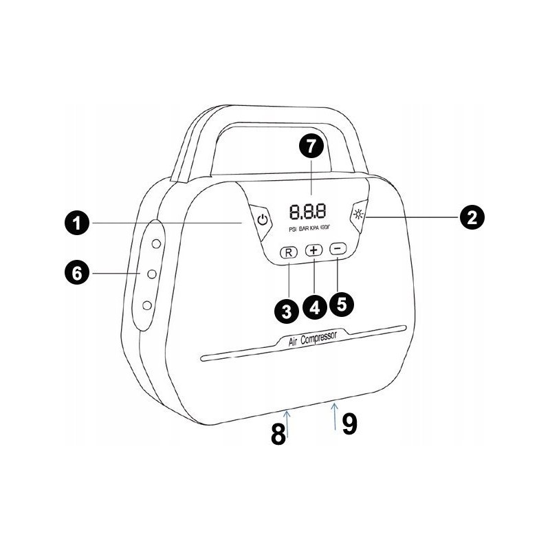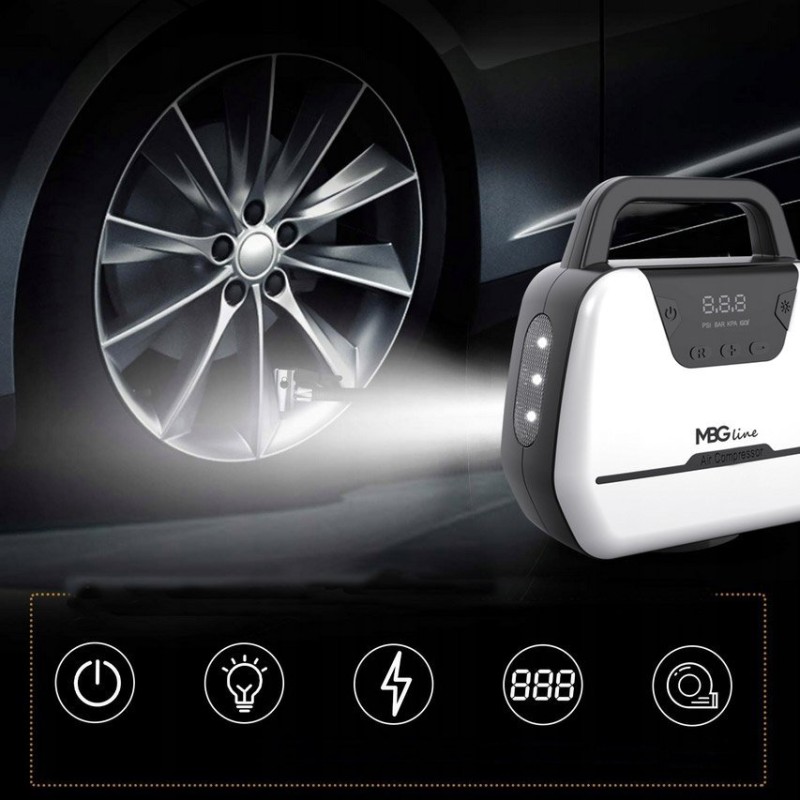 Der Kompressor ist mit einer leistungsstarken Taschenlampe ausgestattet, die aus drei LEDs besteht. Die an der Seite des Kompressors angebrachte Taschenlampe eignet sich ideal zum Aufpumpen von Reifen im Dunkeln – du kannst die Druckdüse problemlos am Ventil anschließen.