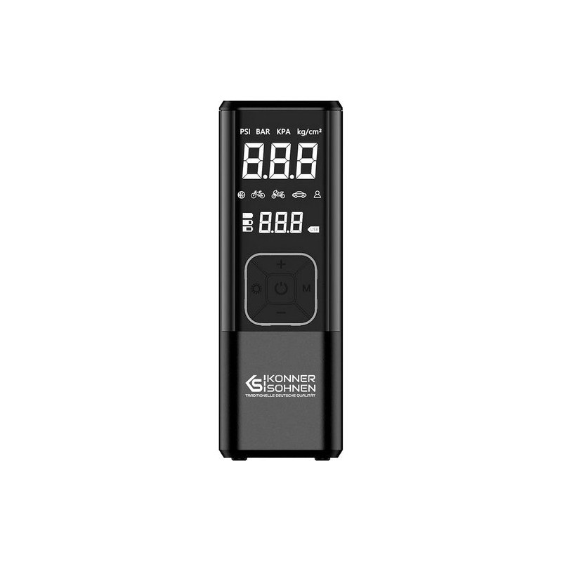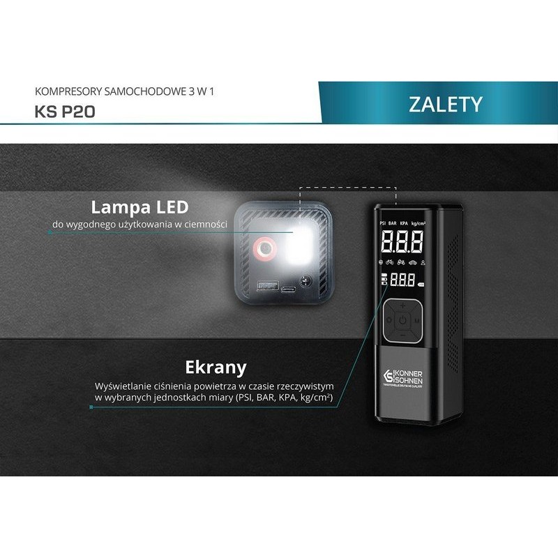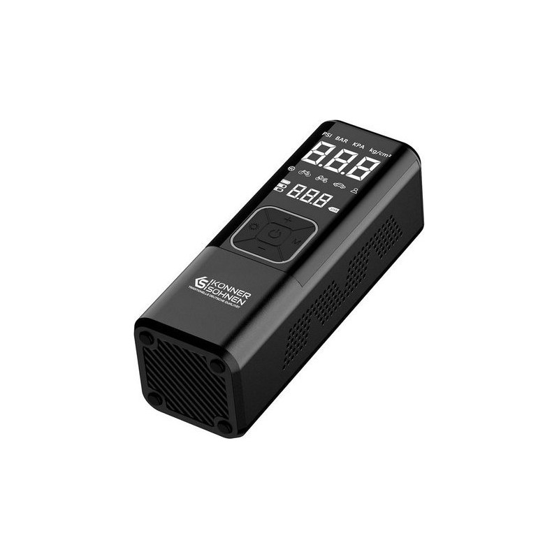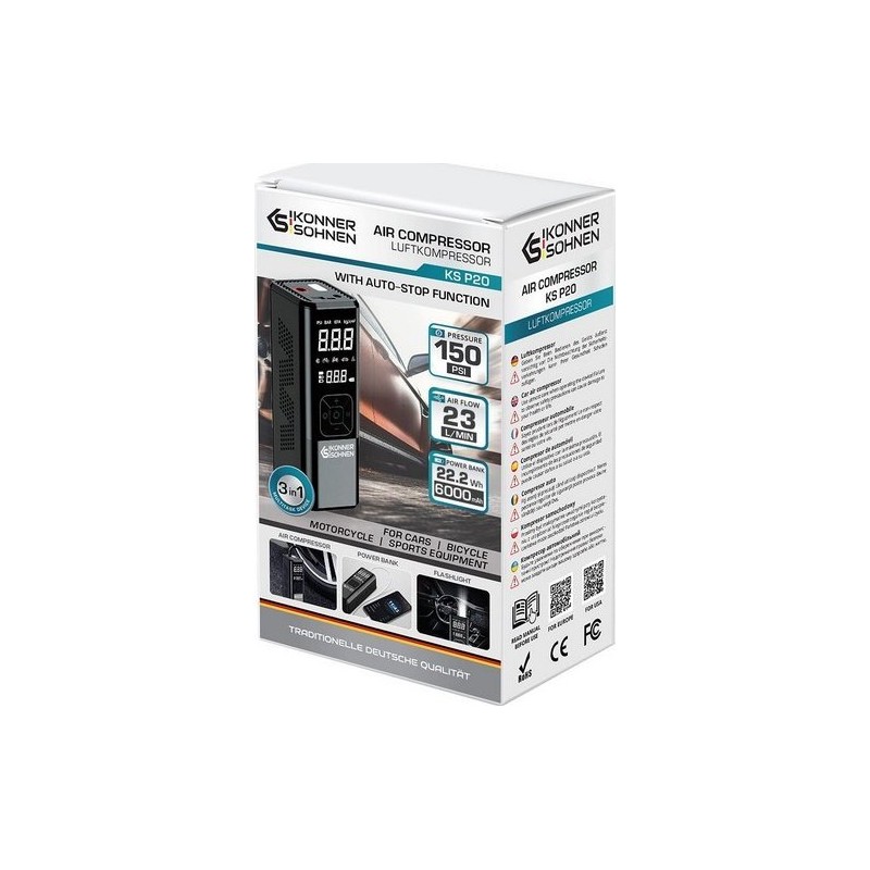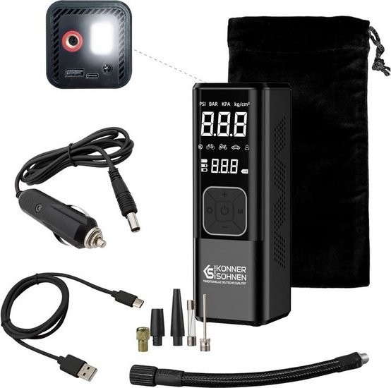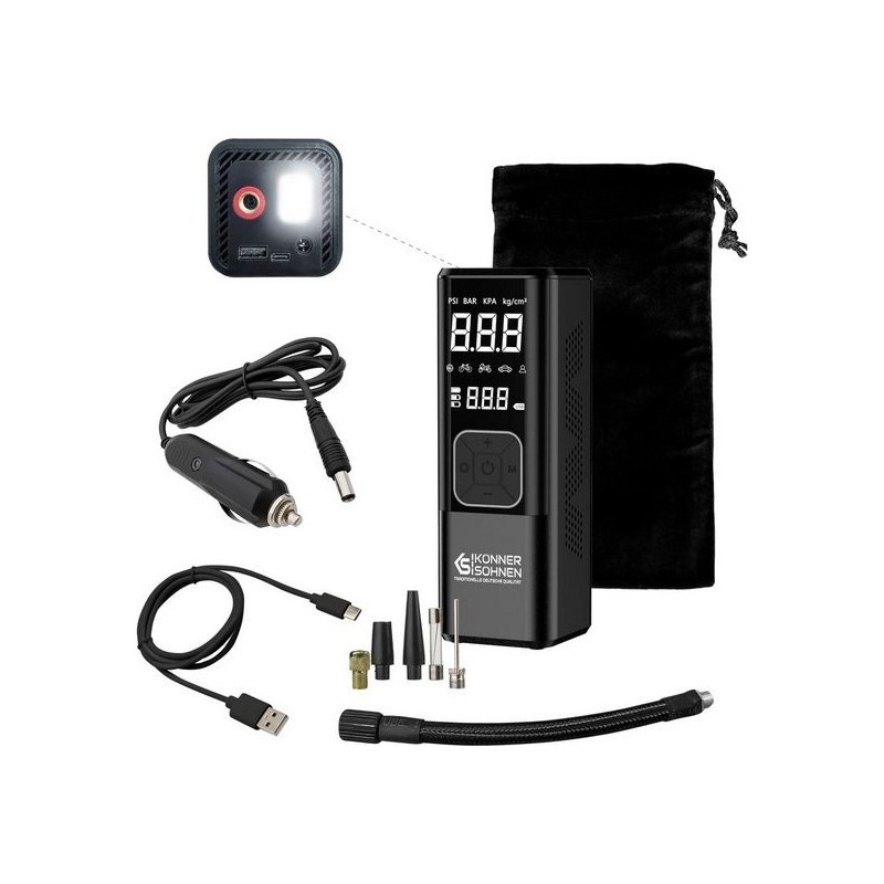 TECHNISCHE DATEN:Nennleistung: 120 WAkku, mAh: 3 × 2000Max. Luftdruck, psi: 150Füllgeschwindigkeit, l/min: 23Dauerbetriebszeit, min: 8Verfügbare Maßeinheiten: PSI, BAR, KPA, kg/cm²USB-Ausgang: JA LED-Leuchte: JA Ladespannung, V: 5 Ladezeit des Geräts, Stunden: 4–5 Betriebstemperatur, °C: -10 °C … +45 °C Bruttoabmessungen (LxBxH), mm: 210 × 118 × 73 Bruttogewicht, kg: 0,9 MAXIMALE AUTOMATISIERUNG Der Kompressor KS P20 ermöglicht das Aufpumpen von Reifen innerhalb weniger Minuten, ohne dass ein Anschluss an eine Stromquelle erforderlich ist. Ausgestattet mit einer Auto-Stopp-Funktion – automatische Unterbrechung des Luftstroms nach Erreichen bestimmter Parameter.EINGEBAUTER AKKU Der eingebaute Akku mit einer hohen Kapazität von 6000 mAh ermöglicht die Nutzung des Geräts unabhängig vom Standort und ohne zusätzliche Stromquellen, sodass kein Anschluss an die Fahrzeugbatterie erforderlich ist. Über den USB-Anschluss kann das Gerät zum Aufladen von Geräten verwendet werden.DIGITALES DISPLAYDas Display erleichtert die Bedienung des Geräts und zeigt die Pumpparameter in Echtzeit an. Das Gerät verfügt über 5 Pumpmodi:• Sportgeräte (0 – 1,0 bar)• Fahrrad (0,1 – 10,3 bar)• Motorrad (0,1 – 3,7 bar)• Auto (0,1 – 4,4 bar)• Benutzerdefiniert (0,1 – 10,3 bar)TASCHENLAMPEDie integrierte, helle Taschenlampe am Gehäuse ist nützlich, wenn der Arbeitsbereich im Dunkeln oder bei schlechten Lichtverhältnissen beleuchtet werden muss.AUFSÄTZE Im Set sind 3 Aufsätze zum Aufpumpen aller Arten von Rädern sowie eine Nadel zum Aufpumpen von Bällen enthalten: Basketball-, Fußball- und andere aufblasbare Wasserspielzeuge. Diese Vielseitigkeit macht sie praktisch für den Einsatz im Urlaub.**...