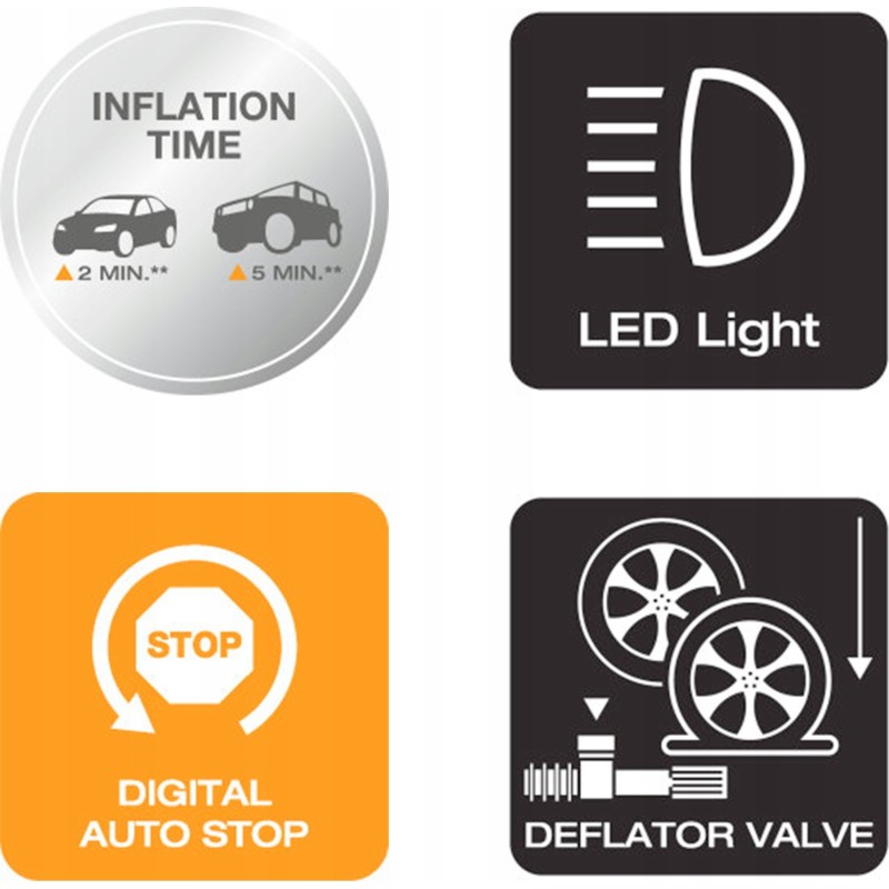 Die OSRAM TYREinflate 830 wurde speziell für den Einsatz bei größeren Fahrzeugen und deren Reifen entwickelt und eignet sich daher ideal für PKWs, Wohnwagen, Wohnmobile, Geländewagen, Kleinbusse und Transporter. Diese Reifenpumpe kann einen 13-Zoll-Reifen in ca. 2 Minuten und einen 22-Zoll-Reifen in ca. 5 Minuten aufpumpen.
