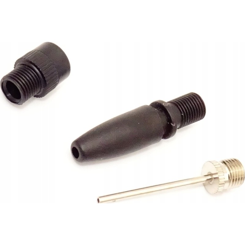 Lieferung mit Aufsätzen: Lange Nadel, Presta-Ventil, Schrader-Aufsatz, Düse mit Klemme