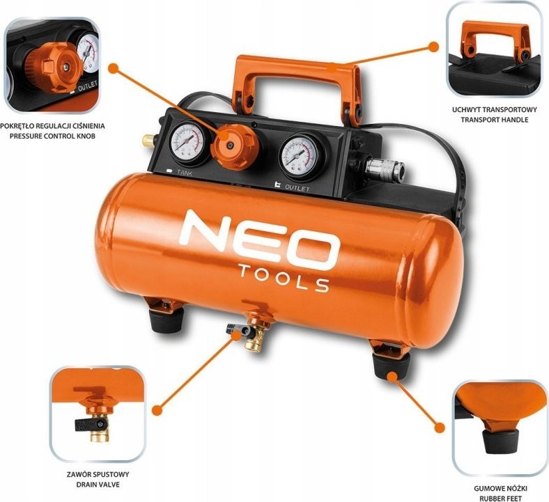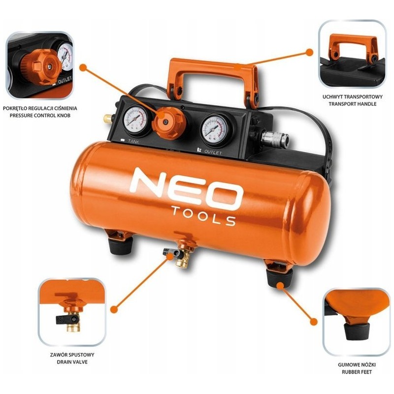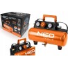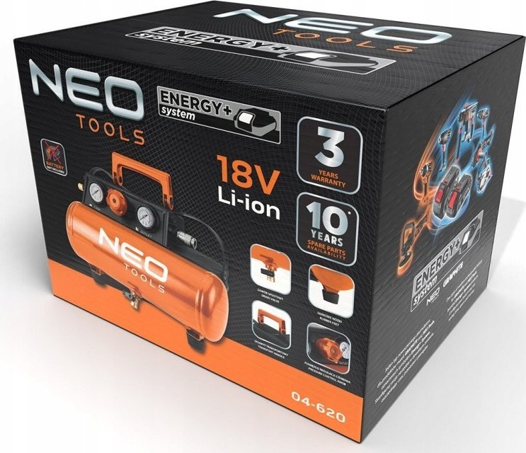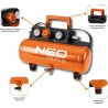 Er zeichnet sich durch ein Tankvolumen von 3,8 l, einen maximalen Druck von 8 bar und eine Leistung von 14 l/Minute aus. Der NEO-Kompressor wird zum Aufpumpen, zur Entfernung von Verschmutzungen und zur Versorgung kleiner Druckluftwerkzeuge empfohlen.