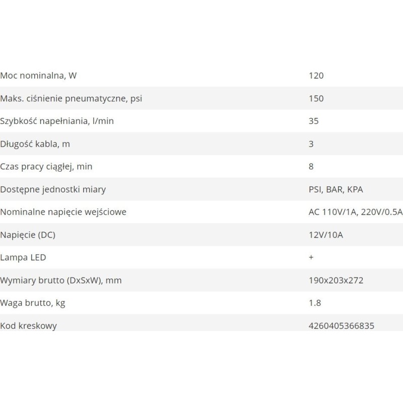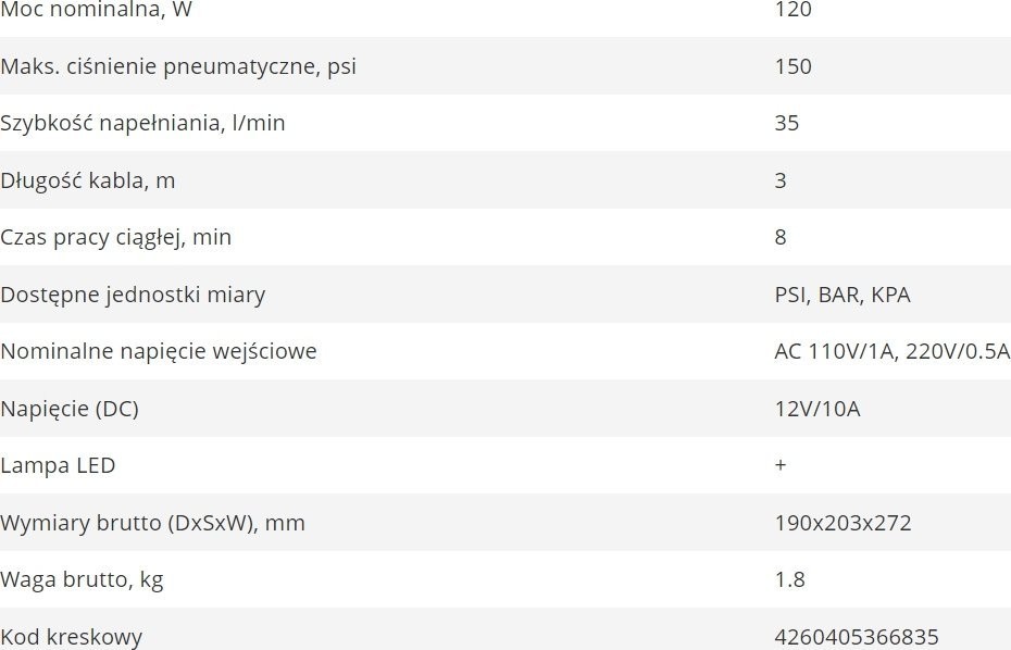 Ausgestattet mit einer Auto-Stopp-Funktion – automatische Unterbrechung der Luftzufuhr nach Erreichen bestimmter Parameter. Verfügt über ein Kabel mit einer angemessenen Länge – 3 m für mehr Bedienkomfort.