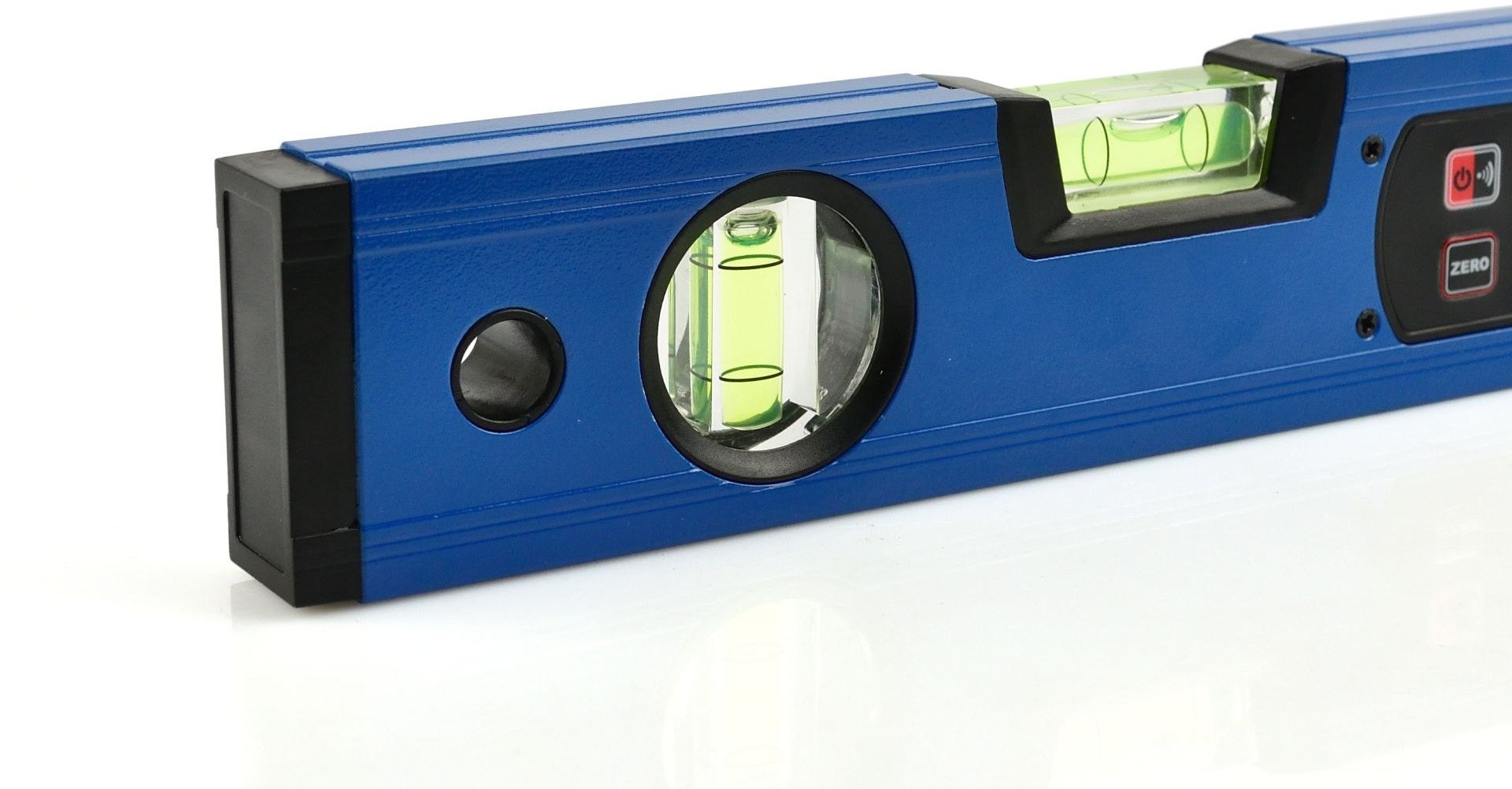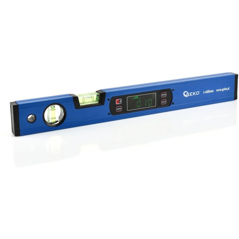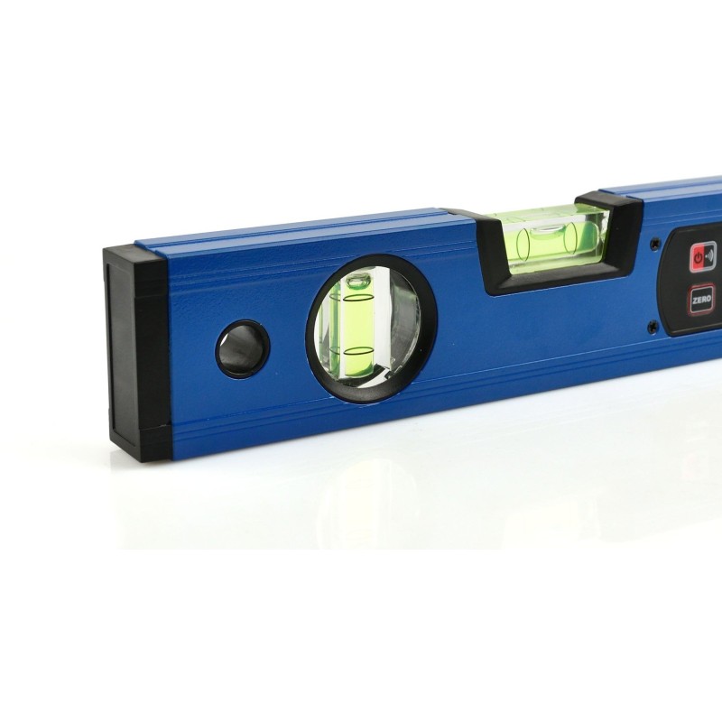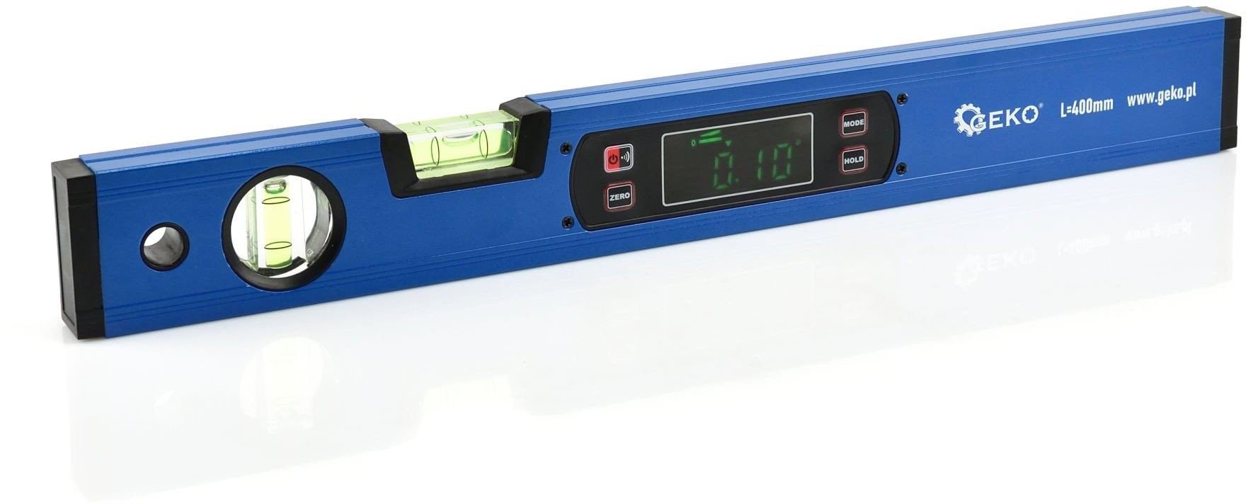 Digitale Wasserwaage mit einer Länge von 400 mm. Ausgestattet mit 2 Libellen zur Bestimmung der Vertikalen und Horizontalen sowie einem gut lesbaren, beleuchteten Display, mit dem Sie den Neigungswinkel präzise messen können. Das Gehäuse der Wasserwaage besteht aus robustem Aluminium. Die HOLD-Funktion ermöglicht es, den aktuellen Messwert auf dem Display zu halten. Die ZERO-Funktion ermöglicht es, den Winkelmesser in jeder beliebigen Position auf Null zu stellen und eine Referenzmessung durchzuführen. Das Gerät ist mit 4 starken Magneten ausgestattet, die bei Messungen an Stahlelementen äußerst nützlich sind.