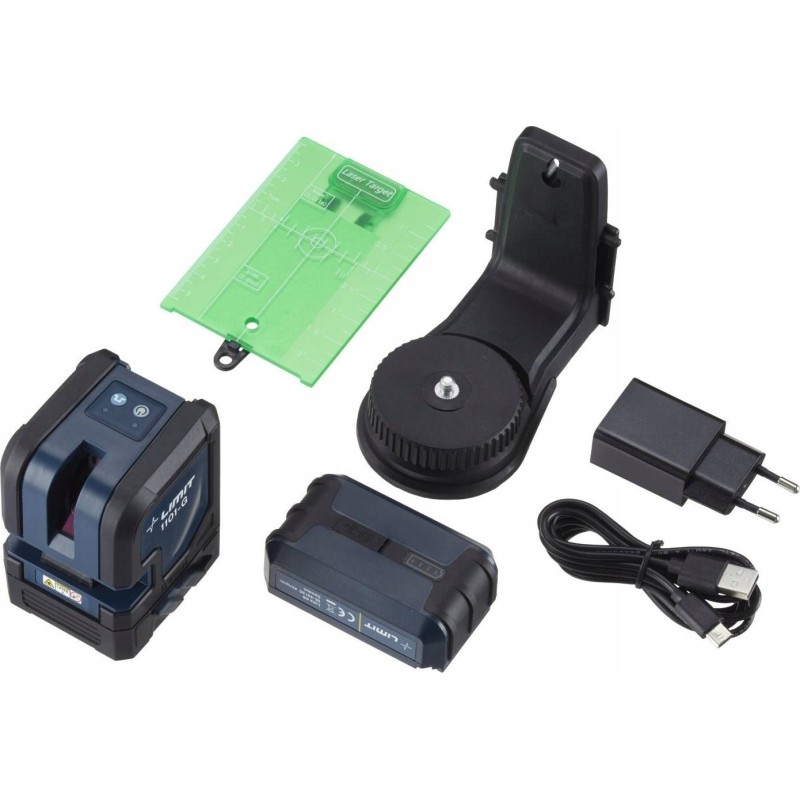 Der Limit-Kreuzlaser mit sehr hellem blauem Licht, der eine horizontale und vertikale Linie projiziert. Die vertikale Linie verläuft in einem Winkel von 120 Grad bis zur Decke. Die Linien können einzeln oder gemeinsam beleuchtet werden. Die Selbstnivellierungsfunktion warnt durch blinkende Linien, wenn die Neigung den Selbstnivellierungsbereich überschreitet. Die Selbstnivellierung kann deaktiviert werden, um eine schräge Linie anzuzeigen. Die Arretierung des Schwenkmechanismus dient sowohl als Hauptschalter als auch als Transportsicherung. 2 Laserdioden der Klasse 2, <1 mW, 520 nm. Im Lieferumfang enthalten sind ein Akku mit Ladegerät und USB-Kabel, eine magnetische Wandhalterung und eine reflektierende Zielscheibe in einer weichen Tragetasche.