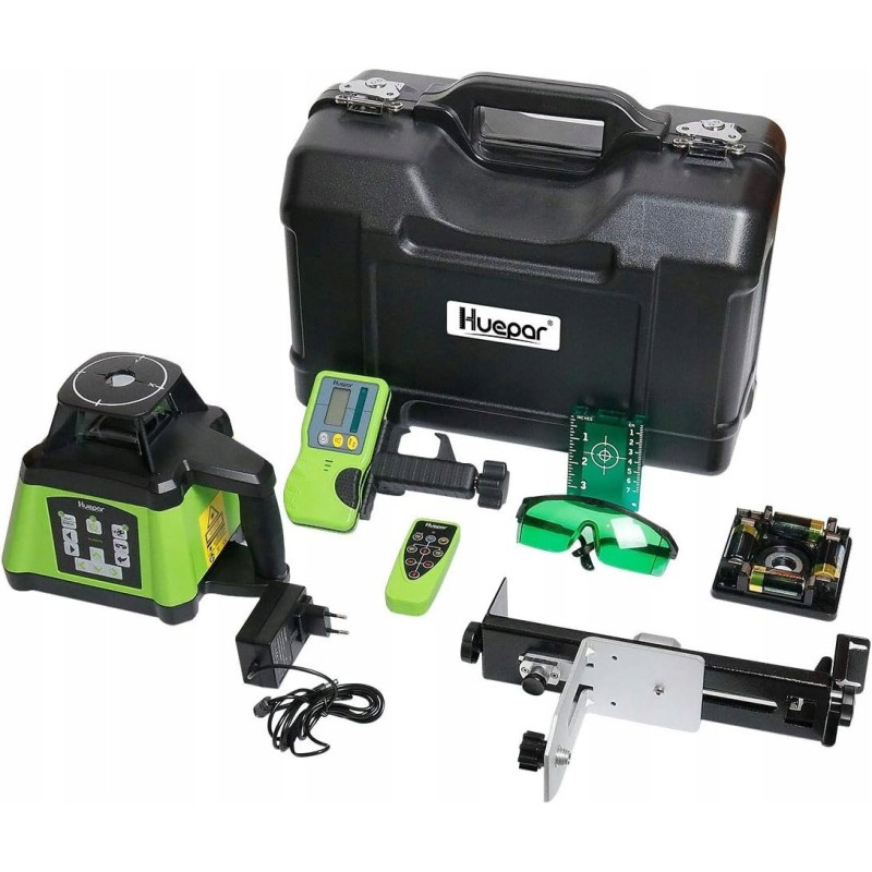 Der Huepar RL200HVG ist ein modernes Rotationslaser-Set, das eine Selbstnivellierung über den gesamten 360-Grad-Bereich bietet. Dank des grünen Laserstrahls von Osram sorgt das Gerät für hervorragende Sichtbarkeit, was es zum idealen Werkzeug für Bau- und Ausbauarbeiten macht. Der Laser projiziert sowohl horizontale als auch vertikale Linien, was die präzise Ausrichtung von Bauteilen erheblich erleichtert.