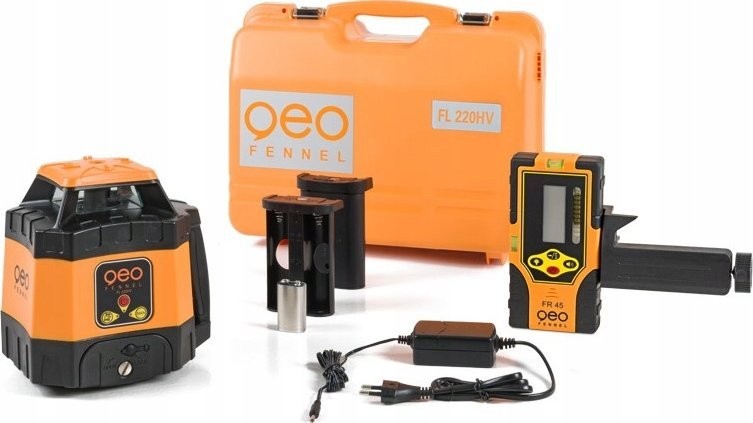 ↪ Set R52-opti der Marke GEO-FENNEL, bestehend aus dem Laser-Nivelliergerät FL 220HV, dem Detektor FR 45, einer Halterung für den Detektor an der Nivellierlatte, einer Fernbedienung, Batterien für die Fernbedienung und den Detektor, Akkus (im Nivelliergerät), ein Ladegerät für die Hauptbatterien, einen Behälter für Alkalibatterien zur Notstromversorgung, eine Einstellbasisplatte, einen Transportbehälter, ein Bau-Stativ mit Kurbelsäule FS 10 sowie eine Teleskop-Nivellierlatte für Laserdetektoren TN 20.