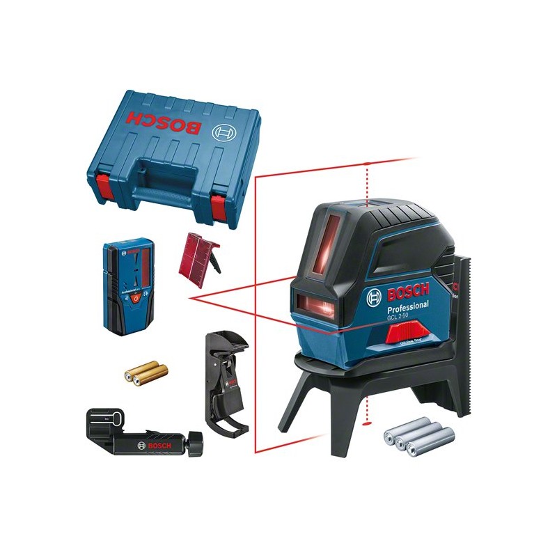 Im Lieferumfang enthalten sind der Bosch Kreuz- und Punktlaser GCL 2-50, der Empfänger LR 6, ein Batteriesatz (3x LR6 und 2x LR03), eine Befestigungsklemme, der Halter RM 1, eine Deckenhalterung, eine Laser-Zielscheibe sowie ein Transportkoffer. Damit erhält der Anwender alles, was er benötigt, um sofort nach dem Kauf mit der Arbeit zu beginnen.