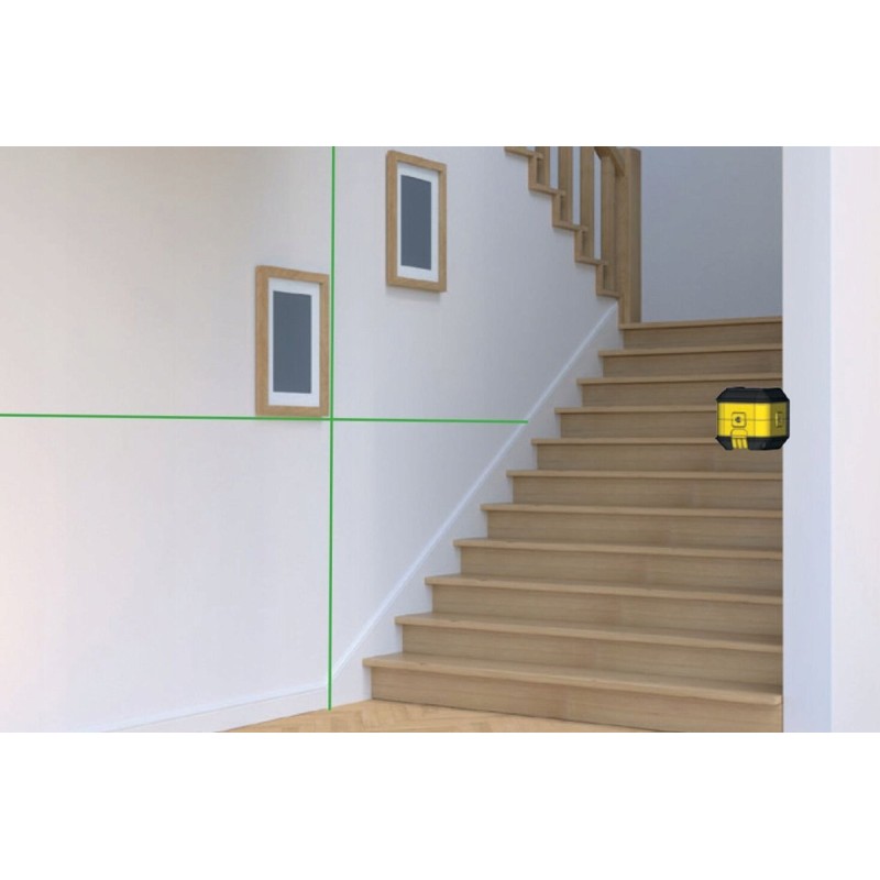 Der Laser strahlt zwei grüne Laserstrahlen (horizontal und vertikal) im 90°-Winkel aus