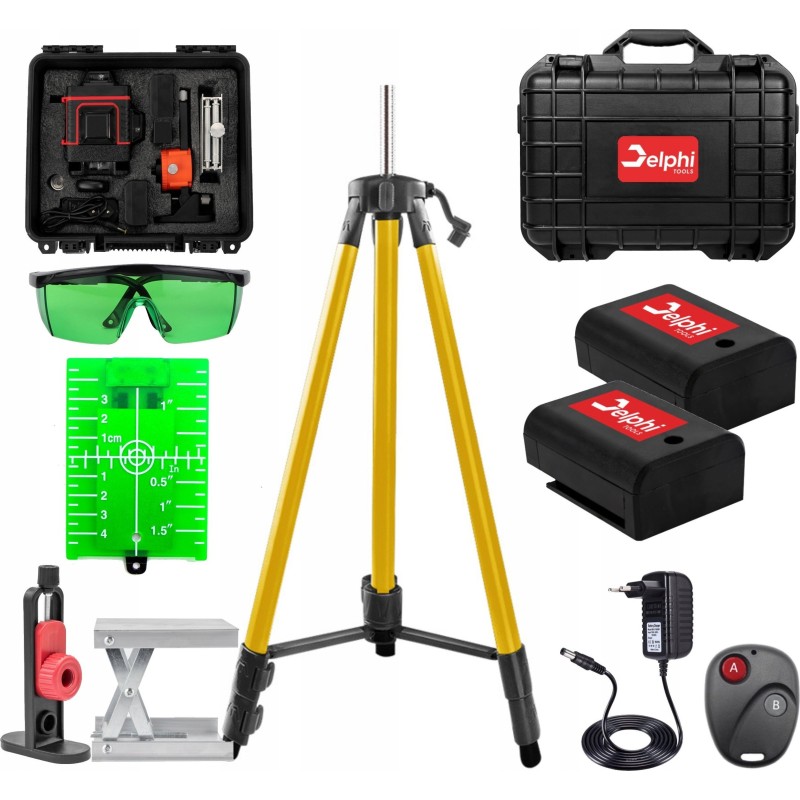 Schon jetzt können Sie den Laser-Wasserwaage, den DELPHI 16-Linien-4D-Kreuzlaser, mit vielen äußerst nützlichen Zubehörteilen kaufen. Was finden Sie im Set?