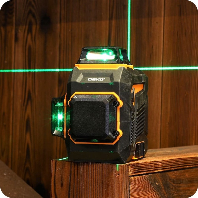 Der DEKO DKLL12PQ1 Flächenlaser ist eine Variante der Kreuzlaser, die Linien im Bereich von 360°projiziert. Wird das Gerät in der Mitte des Raumes aufgestellt, erzeugt es drei Linien, die um das Gerät herum an allen Wänden, der Decke und dem Boden verlaufen. Flächensichtlaser sind im täglichen Gebrauch sehr praktisch.