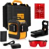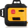 Der Kreuzlaser strahlt Strahlen in drei Ebenen aus. Jeder Strahl hat einen Bereich von 360 Grad und ist rot. Ein horizontaler Strahl und zwei vertikale Strahlen, die sich im 90-Grad-Winkel schneiden.