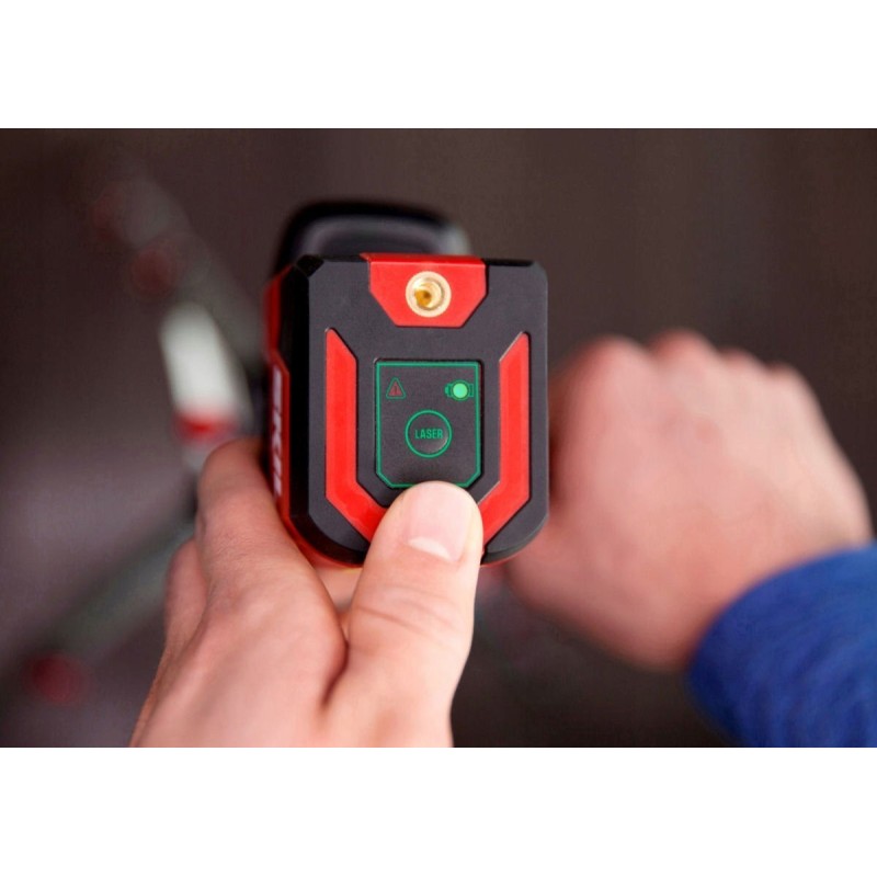 Der Laser ist mit einer Selbstnivellierungsfunktion ausgestattet, wodurch eine manuelle Einstellung entfällt. Nach dem Einschalten ist das Gerät in nur wenigen Sekunden betriebsbereit. Es bietet die Möglichkeit, Laserlinien in jedem beliebigen Winkel zu projizieren und zwei Linien gleichzeitig (horizontal und vertikal) anzuzeigen. Zusätzliche Markierungen auf den Laserlinien erleichtern die präzise Abstandsmessung.
