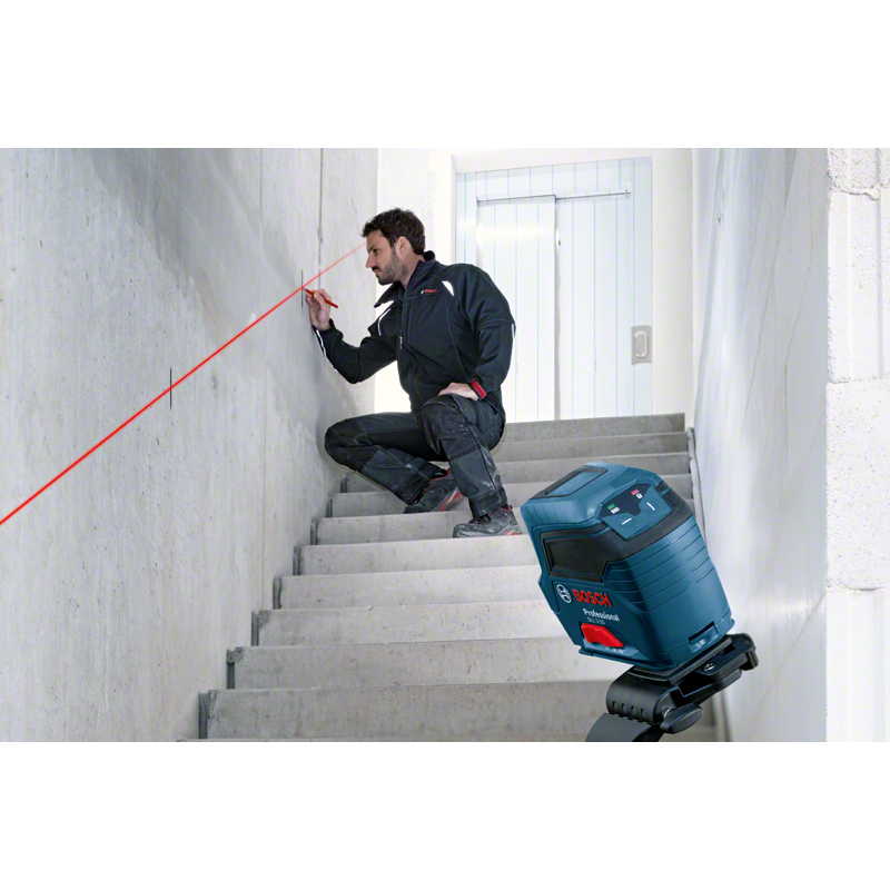 Diese kann zwischen Wand und Decke platziert, aber auch an den Wänden abgestützt werden. Dank des drehbaren Kopfes und der Befestigungsschraube sitzt der Linienlaser darauf genauso sicher wie auf einem Stativ, sodass auch in sehr großen Höhen eine horizontale Linie projiziert werden kann. Wenn Sie über ein Stativ oder eine Säule mit schwenkbarem Kopf verfügen, kann der GLL 2-10 dank der Pendelsperre auch schräg betrieben werden, was das Abstecken von Elementen entlang von Treppen oder geneigten Dachflächen erleichtert.