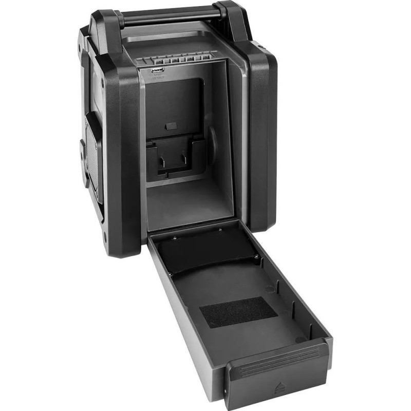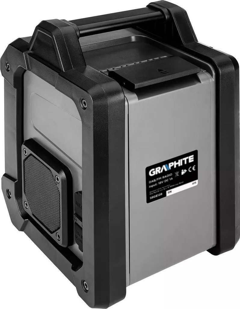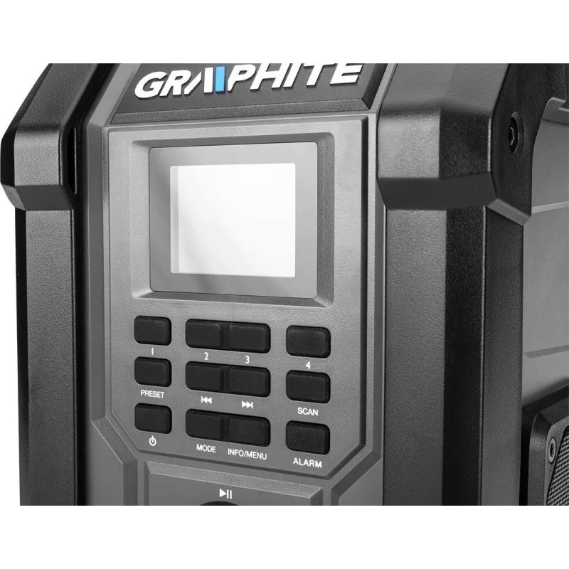 Ein extrem robustes Baustellenradio der Marke GRAPHITE, das sowohl über Netzstrom als auch über Akku betrieben werden kann. Es gehört zur Energy+ Produktfamilie, die auf leistungsstarken 18-V-Lithium-Ionen-Akkus basiert. Das Radio verfügt über zwei Lautsprecher – jeder mit einer beeindruckenden Leistung von 15 W. Das integrierte, praktische 2,4-Zoll-Farbdisplay zeigt die aktuelle Frequenz an (das Gerät unterstützt FM im Bereich von 87,5 bis 108 MHz und DAB im Bereich von 174 bis 240 MHz). Insgesamt stehen rund 60 Sender zur Auswahl!