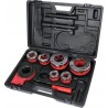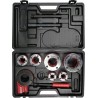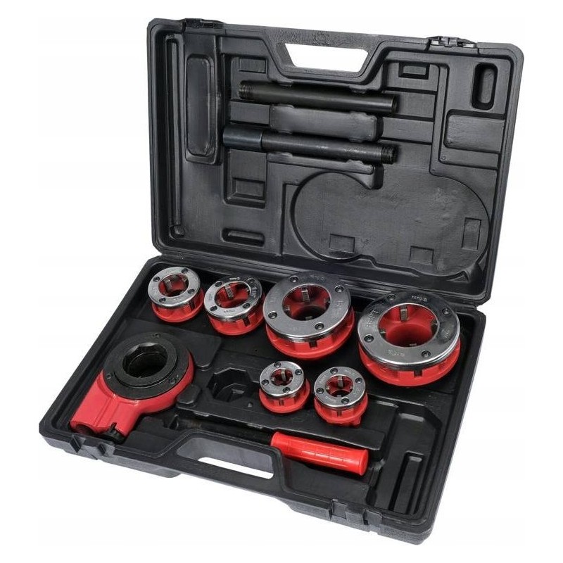 Hochwertiges Set zum Gewindeschneiden von Rohren. Der Ratschenmechanismus der Gewindeschneidvorrichtung und der Umkehrschalter erleichtern das Gewindeschneiden erheblich. Die Köpfe sind aus dem sehr widerstandsfähigen und robusten Werkstoff 9Cr2 gefertigt.