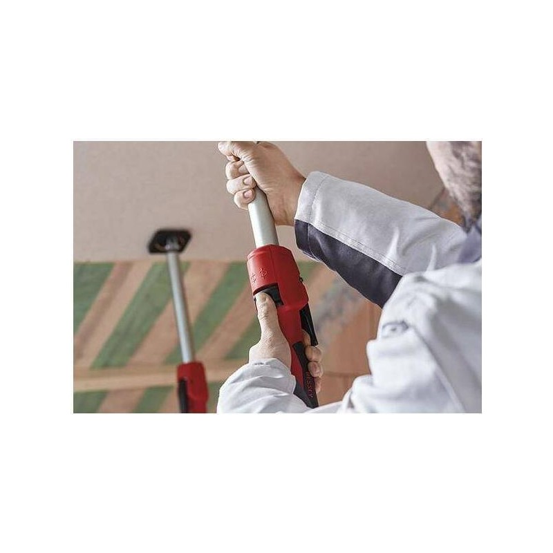 Decken- und Montagehalterung Ausführung: hochfeste Stahlrohrkonstruktion mit gummierten PVC-Auflageflächen, die sich um 45° neigen lassen. Schnelle Verstellung per Knopfdruck, präzise Einhandverstellung per Hebel, Arretierung durch Drehen. Bei vollständig eingefahrenem Teleskopstangen kann die Stütze eine Belastung von bis zu 350 kg tragen.