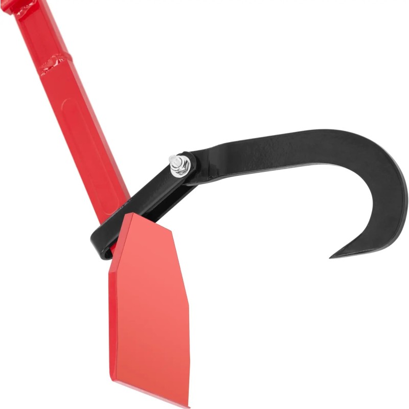 • - Der umkehrbare Haken lässt sich je nach Stammdurchmesser entlang des Griffs verschieben und wird bei Nichtgebrauch eingeklappt.