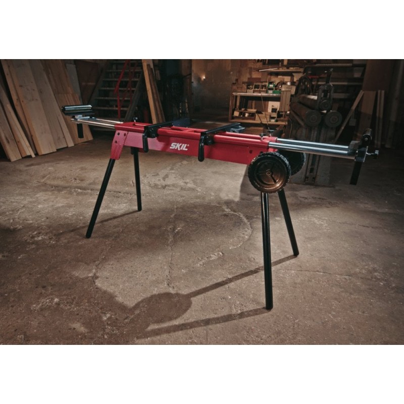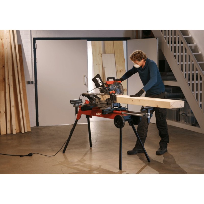 Der SKIL 1300AA verfügt über ausklappbare Stützen, die sich sowohl horizontal als auch vertikal leicht verstellen lassen. Dies ist eine hervorragende Lösung, die die Arbeit mit längeren Materialien erleichtert und für zusätzlichen Halt und Stabilität beim Schneiden sorgt.