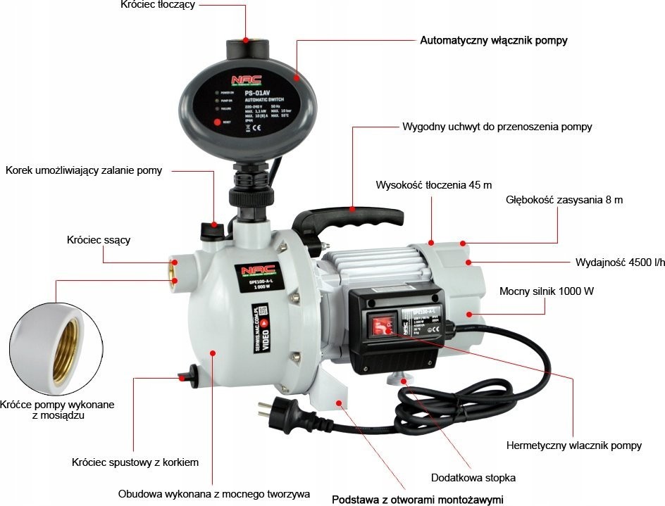 Die Pumpe findet Anwendung im Haushalt und ist ein unverzichtbares Gerät für Kleingärtner. Sie verfügt über einen sehr leistungsstarken 1000-W-Motor, der eine Förderleistung von 4500 Litern/Stunde und einen Betriebsdruck von bis zu 2,8 bar ermöglicht. Die maximale Förderhöhe beträgt 45 Meter und die maximale Ansaugtiefe 8 Meter.