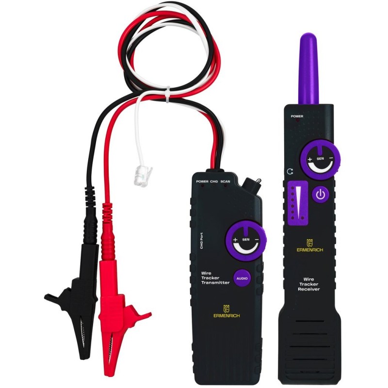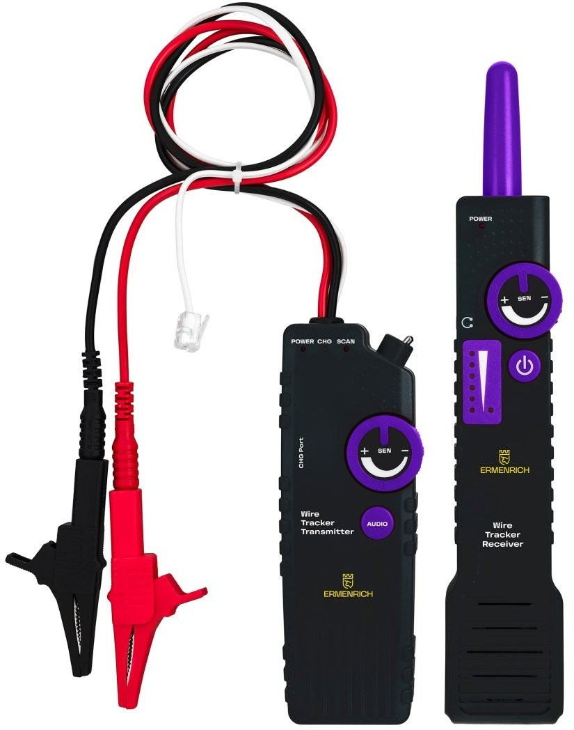 Das Gerät besteht aus einem Sender und einem Empfänger, deren Empfindlichkeit separat eingestellt werden kann. Beide Geräte werden über integrierte Akkus mit Strom versorgt. Das Set enthält ein Ladekabel. Der Leitungsdetektor Ermenrich Ping SM100 ist mit Kopfhörern erhältlich, die sich bei der Arbeit in lauten Umgebungen bewähren.