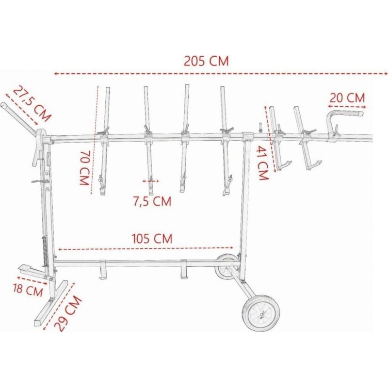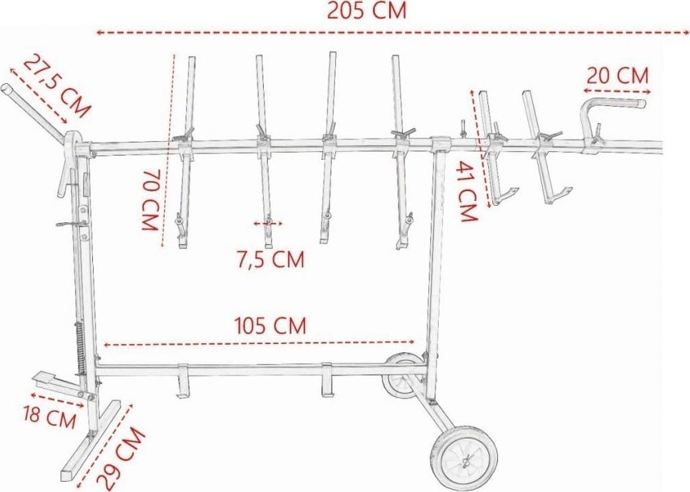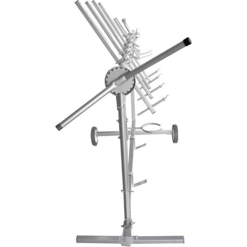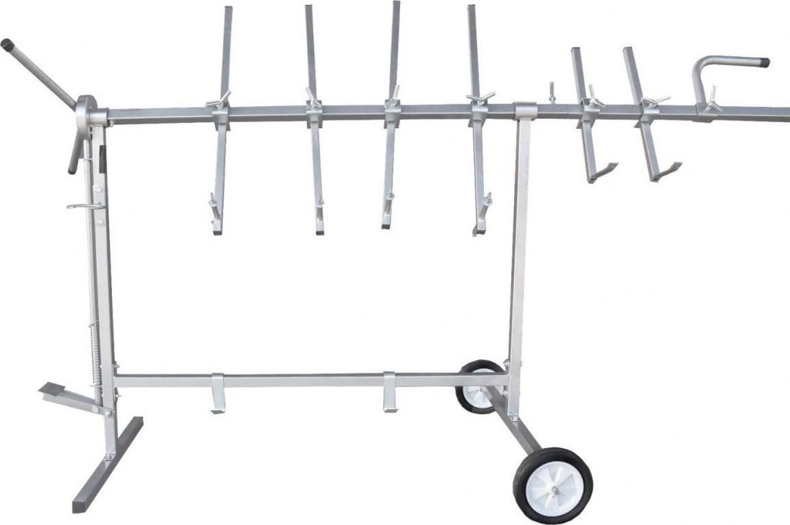 Der Ständer ist mobil und lässt sich leicht umstellen, was die Arbeit in der Werkstatt erheblich erleichtert. Er verfügt über 2 Räder, die mit einer in Lackierbetrieben verwendeten chemikalienbeständigen Gummibeschichtung versehen sind. Das Drehsystem mit arretierbarem Pedal ermöglicht das Drehen der Teile um 360° und das Einstellen in verschiedene Positionen. Die Zähne am Sperrrad sind perfekt aufeinander abgestimmt, wodurch die am Ständer aufgehängten Teile sehr stabil sind und nicht wackeln. Der gesamte Rahmen wurde aus hochwertigem Stahl gefertigt, was eine lange Lebensdauer des Produkts gewährleistet.