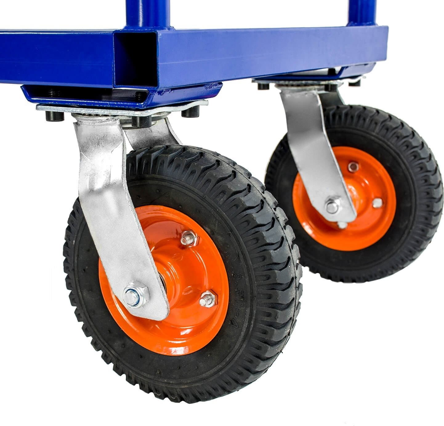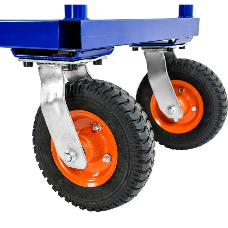• Stabile, luftgefüllte Räder mit Profil – der Reifendruck kann an das Gewicht der Ladung angepasst werden, sie verhindern ein Wegrutschen und eignen sich hervorragend für jeden Untergrund