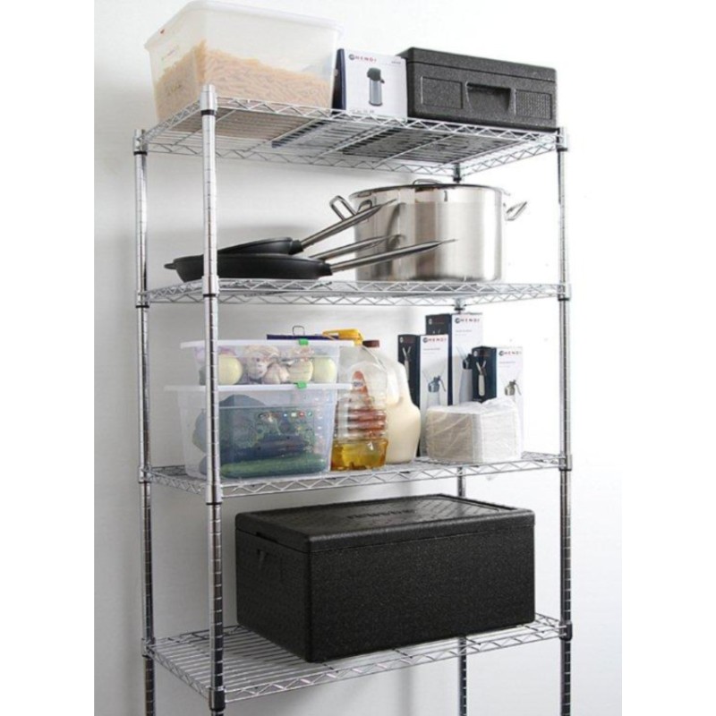 Das Drahtregal der Marke Hendi ermöglicht dank seiner hohen Tragkraft die Lagerung großer Mengen an Produkten. Jedes der fünf Regalböden hat bei gleichmäßiger Belastung eine maximale Tragkraft von 80 kg. Die Position der Regalböden ist verstellbar. Die Gesamthöhe des Regals beträgt 1830 mm. Die offene Bauweise des Regals erleichtert das Einräumen und den Zugriff auf die Produkte von allen Seiten. Das Regal ist zur Selbstmontage bestimmt.