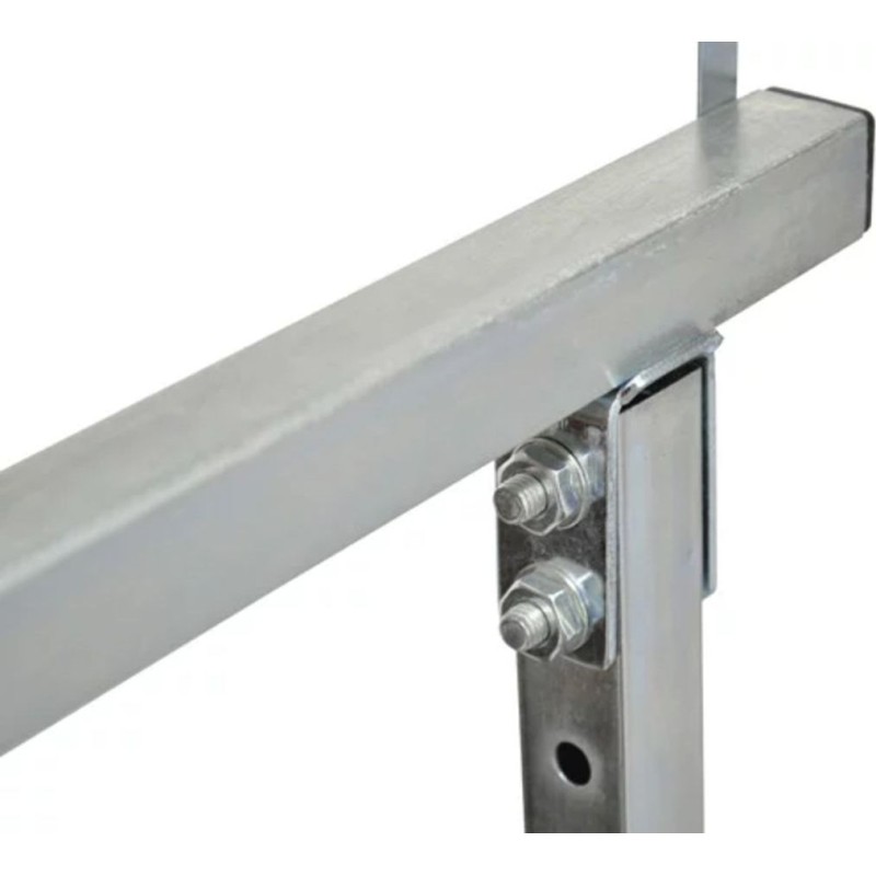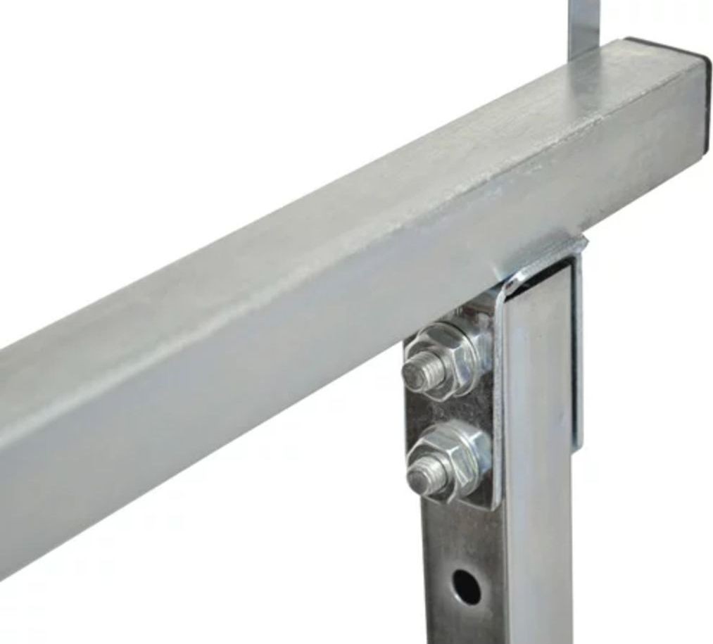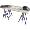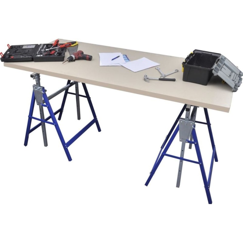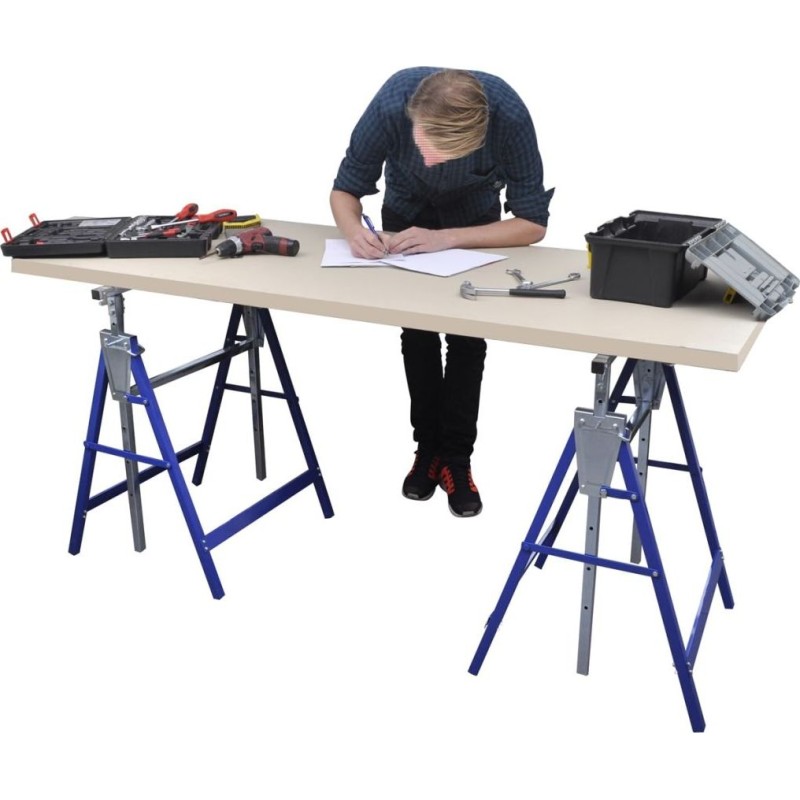 Zwei Bau-Bockständer mit Rahmen, deren Höhe von 81 cm bis 130 cm verstellbar ist. Sie sind tragbar und zusammenklappbar, und die schräge Seite verhindert zudem ein Umkippen. Die