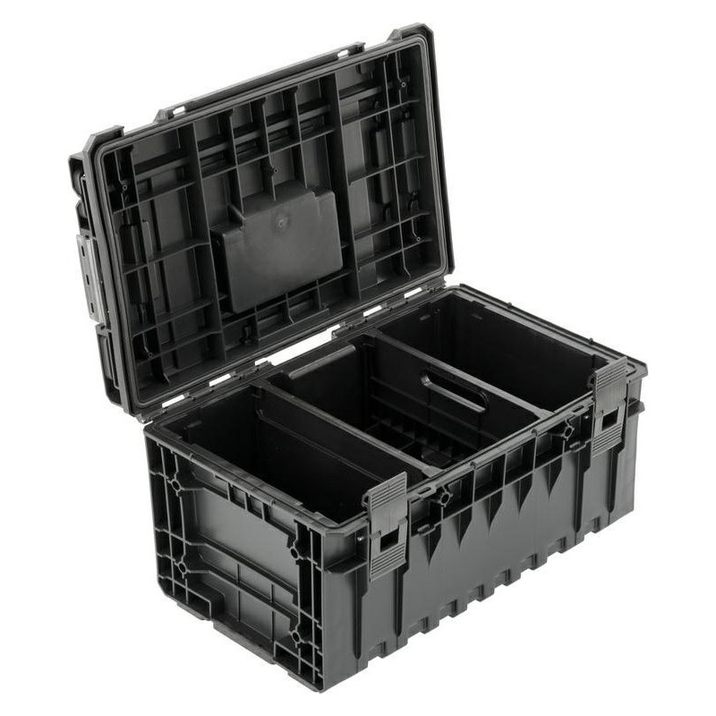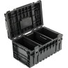 Großer Werkzeugkoffer mit einem Fassungsvermögen von 38 l. Er ist mit zwei verstellbaren Fächern ausgestattet, von denen eines als Halterung dient, sodass jedes Werkzeug seinen festen Platz hat. Die Kiste ist mit einer elastischen Dichtung ausgestattet, die Schutz vor dem Eindringen von Staub und Wasser bietet. Die verstärkte Konstruktion des Deckels und des Korpus ermöglicht eine hohe Tragfähigkeit. Die Kiste hält einem Druck von bis zu 100 kg stand und ermöglicht so die Schaffung bequemer Arbeitsplattformen. Die Verbindungselemente im Deckel ermöglichen die Verbindung mit anderen Elementen der Systeme S1 und S12.
