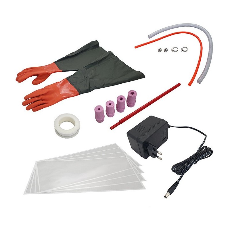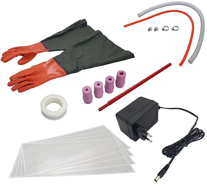 Im Lieferumfang der Sandstrahlmaschine ist alles enthalten, was für den Arbeitsbeginn erforderlich ist. Dazu gehören eine Sandstrahlpistole, vier Keramikdüsen, Arbeitshandschuhe, Teflonband, Ersatzschutzkappen für die Sichtscheibe sowie eine Bedienungsanleitung. Damit erhält der Anwender eine vollständige Ausstattung für eine effektive Reinigung.