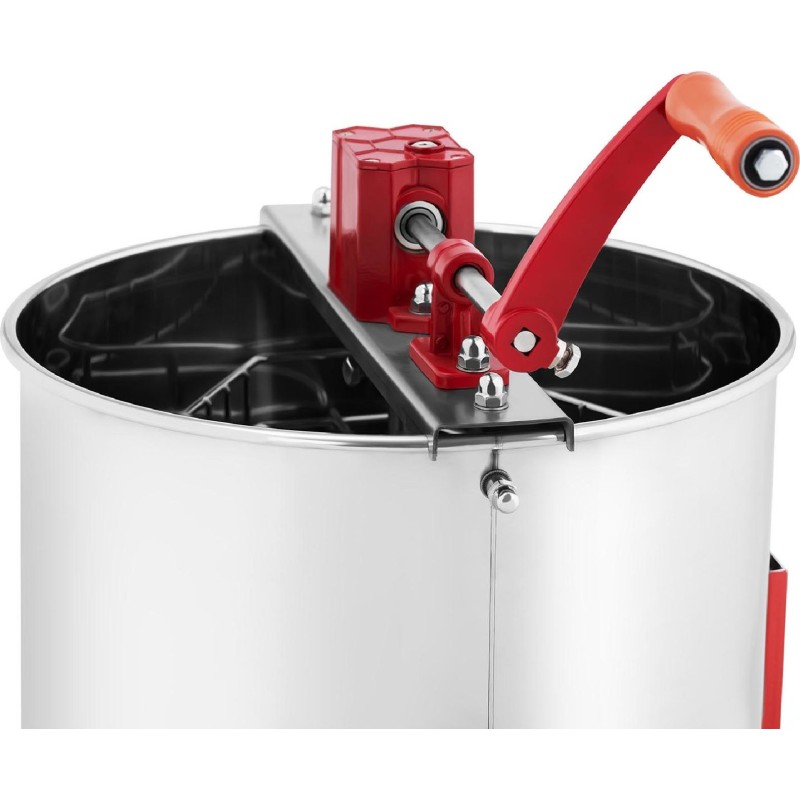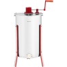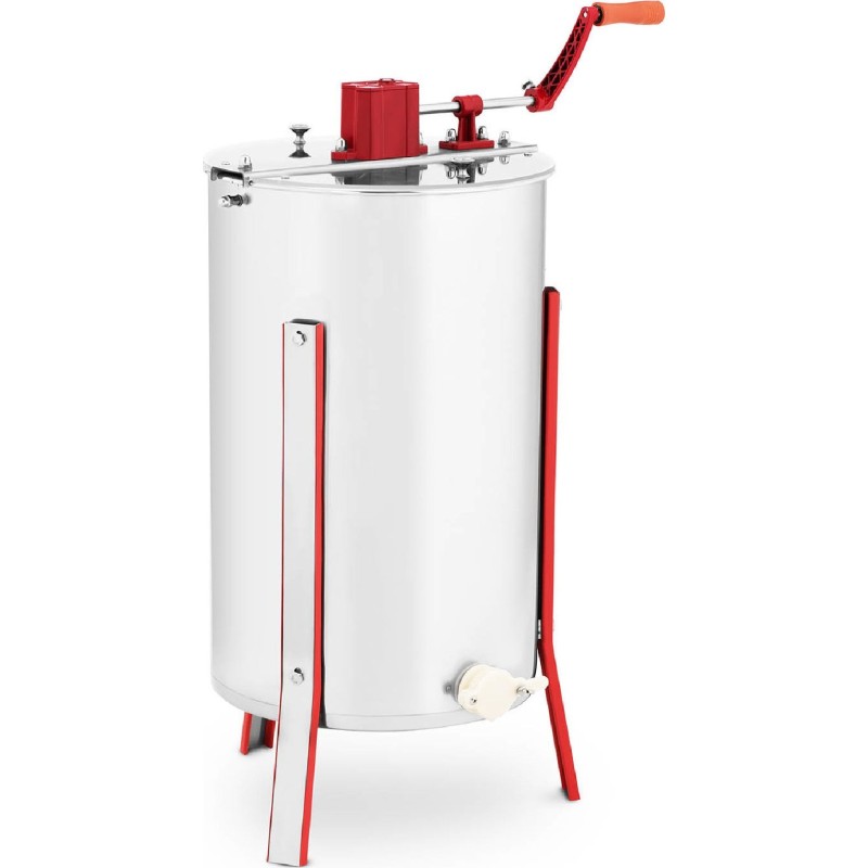 Die Zentrifuge kann gleichzeitig Honig aus 3 Wabenrahmen schleudern. Die Honigschleuder besteht aus Edelstahl und hochwertigem Kunststoff. Das Getriebe ist aus gehärtetem Stahl gefertigt. 3 Standfüße sorgen für die Stabilität des Geräts. Die Honigschleuder verfügt über einen Hahn zum einfachen Abfüllen des Honigs. Das Schleudern erfolgt manuell mittels einer Kurbel.