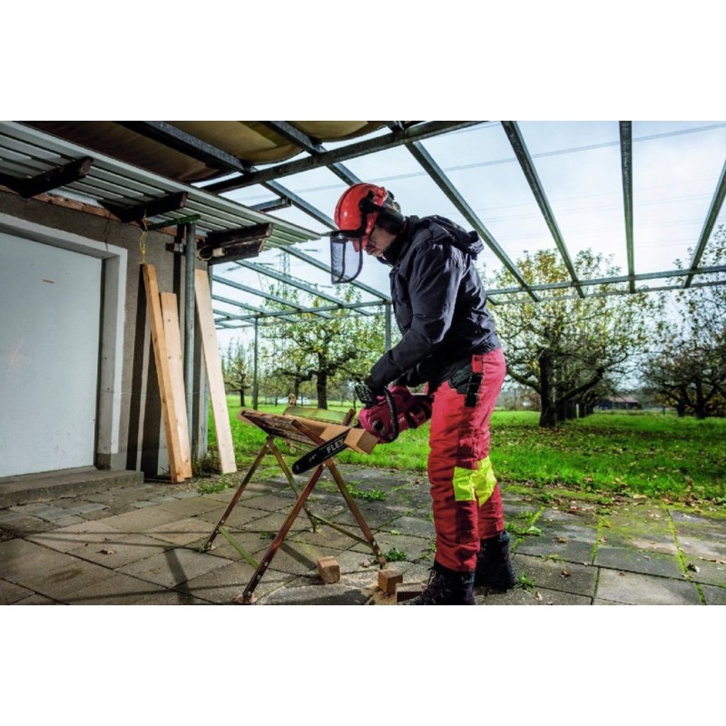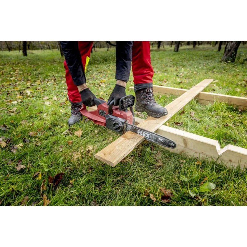 Leistungsstarke 2 x 18-V-Akku-Kettensäge mit 35-cm-Schiene für schnelle Schnitte, z. B. beim Entasten und in Holz mit einer Dicke von bis zu ca. 30 cm.